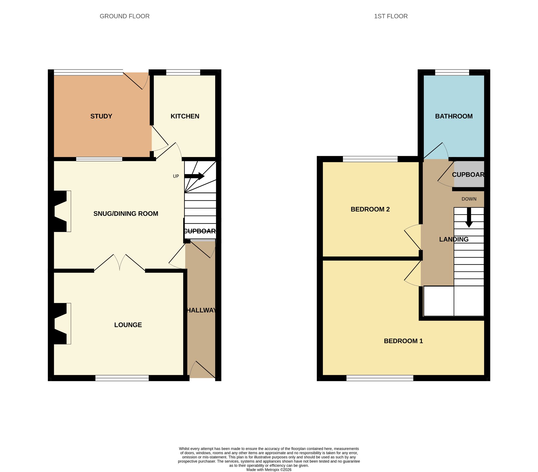 To be sold with no upper chain, the property briefly comprises of 2 spacious and brightly decorated reception rooms along with a kitchen and a diverse side room currently used as study. The first floor is home to 2 spacious double bedrooms with the master bedroom boasting 2 built-in wardrobes, as well as a separate stylish and spacious bathroom with a bath and separate shower. To the rear exterior and is a generous private yard with decking.
