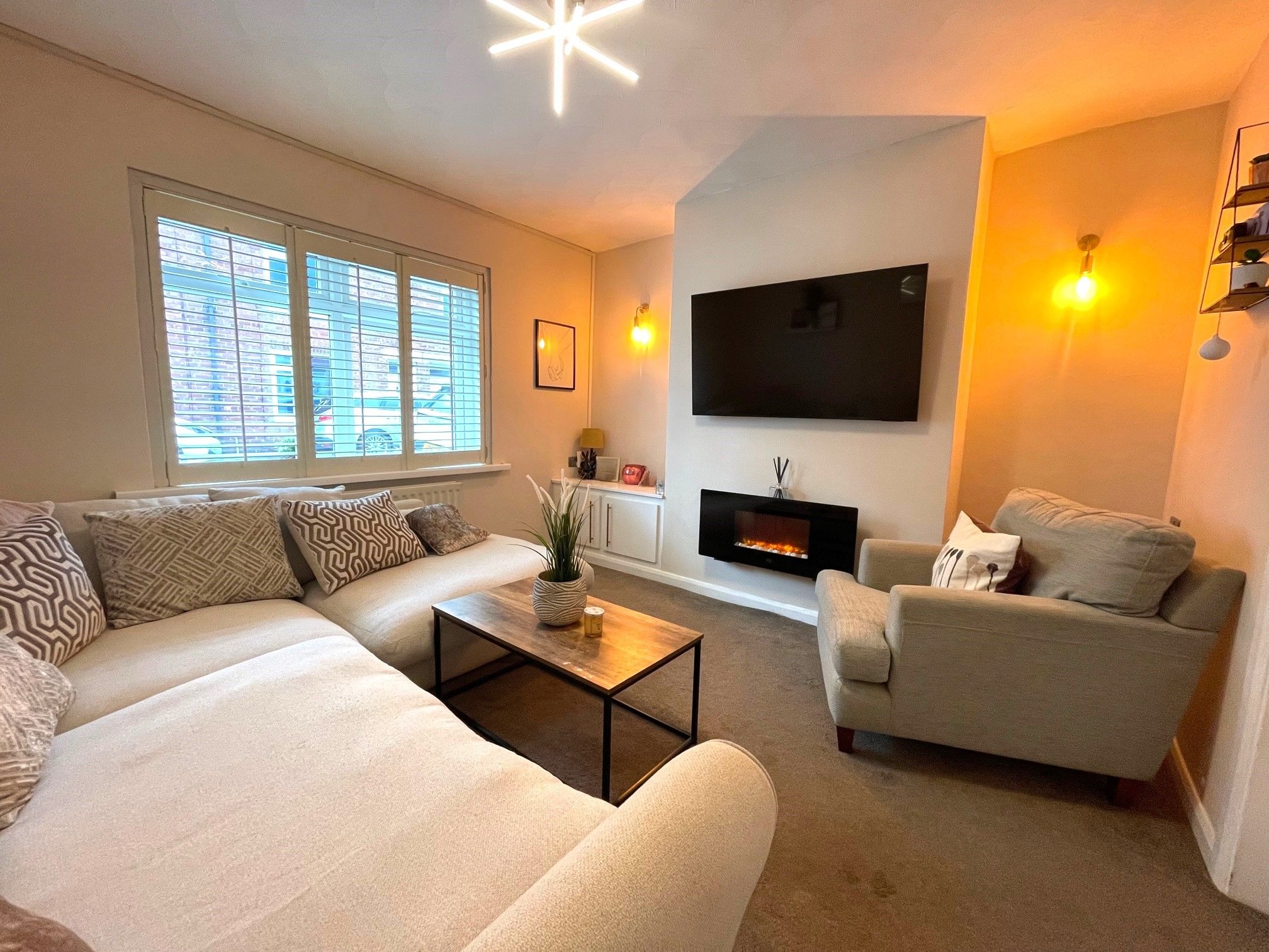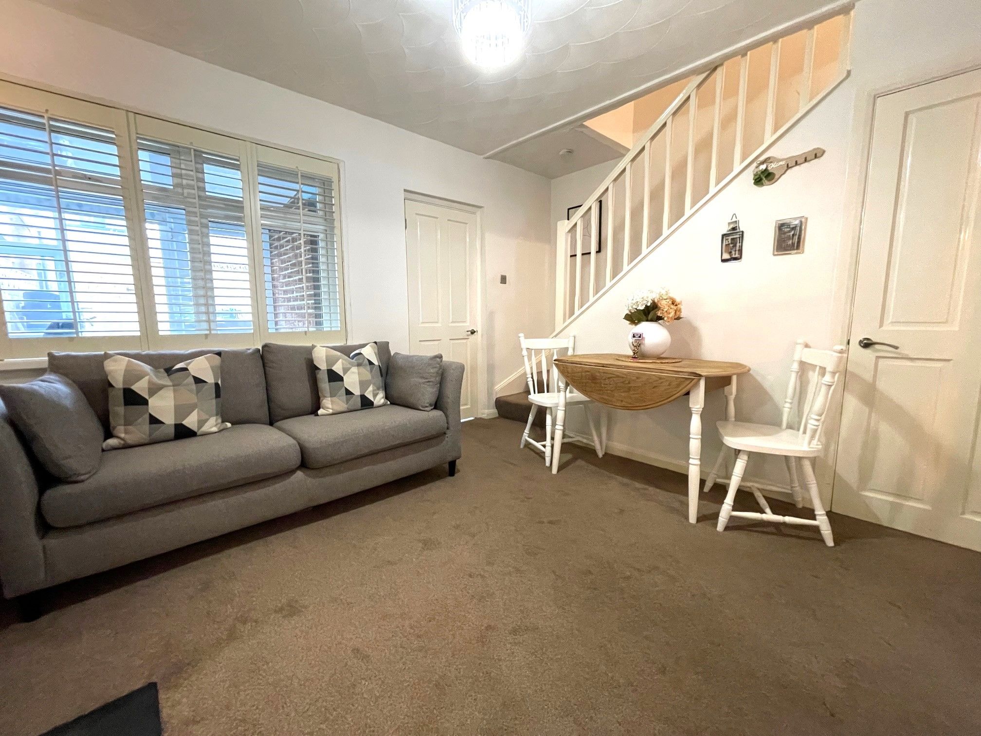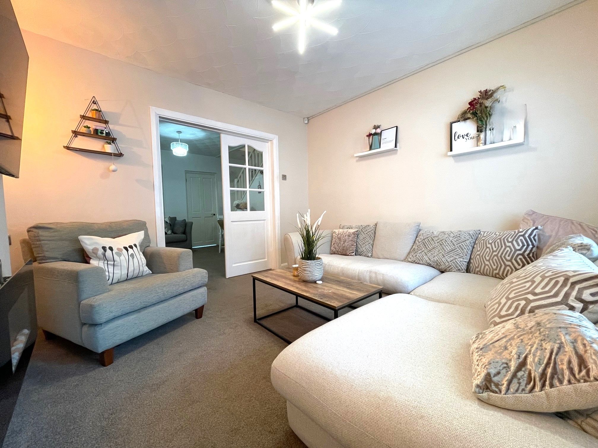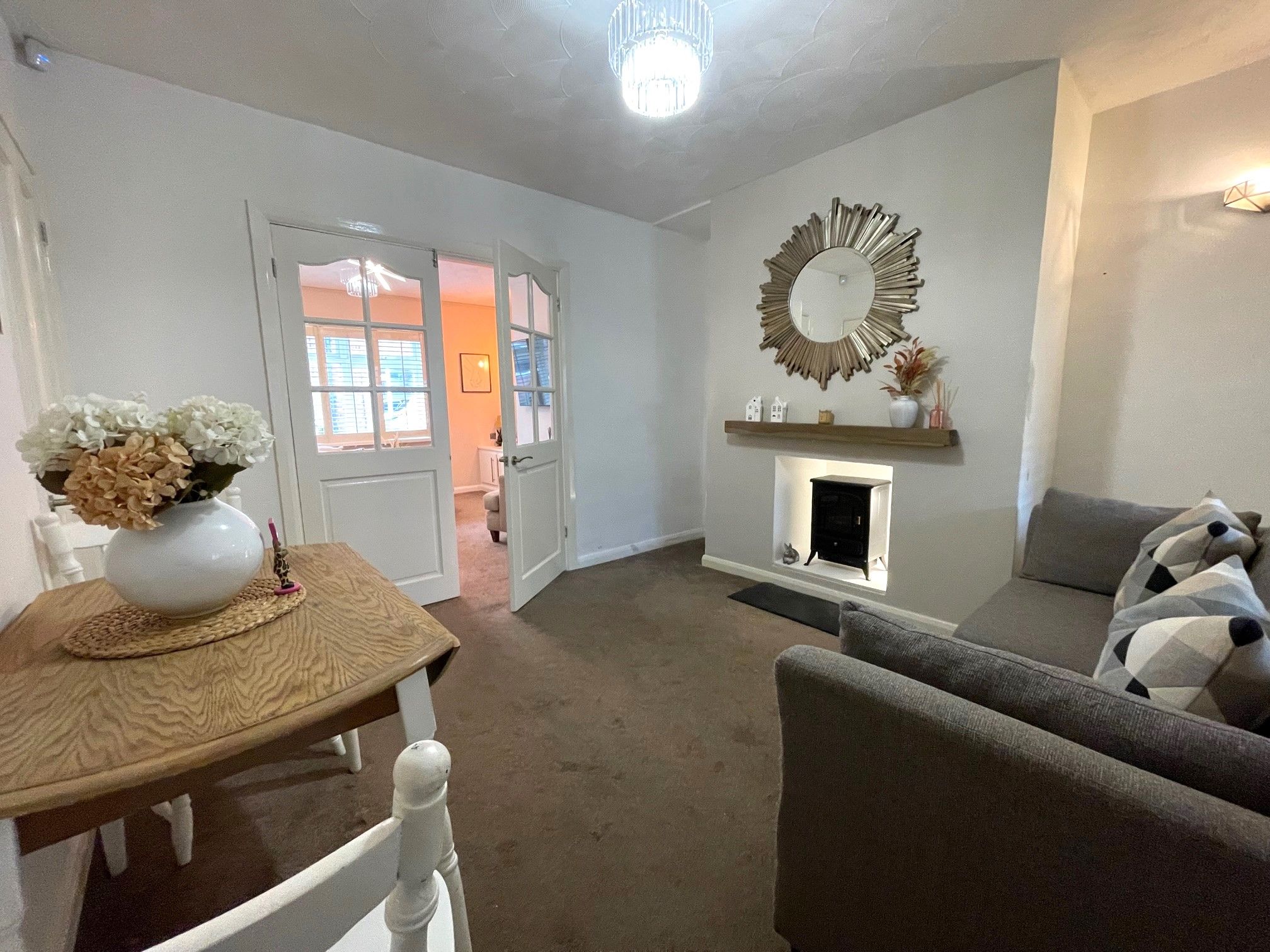 Lounge - 11'5 x 11'8 (3.52m x 3.61m) - Brightly decorated lounge with carpeting, a front-facing UPVC double glazed window with fitted plantation blinds. Wall mounted radiator as well as a wall mounted electric fire. Pendant light and 2 wall lights. Access to the snug/dining room via internal double French doors.