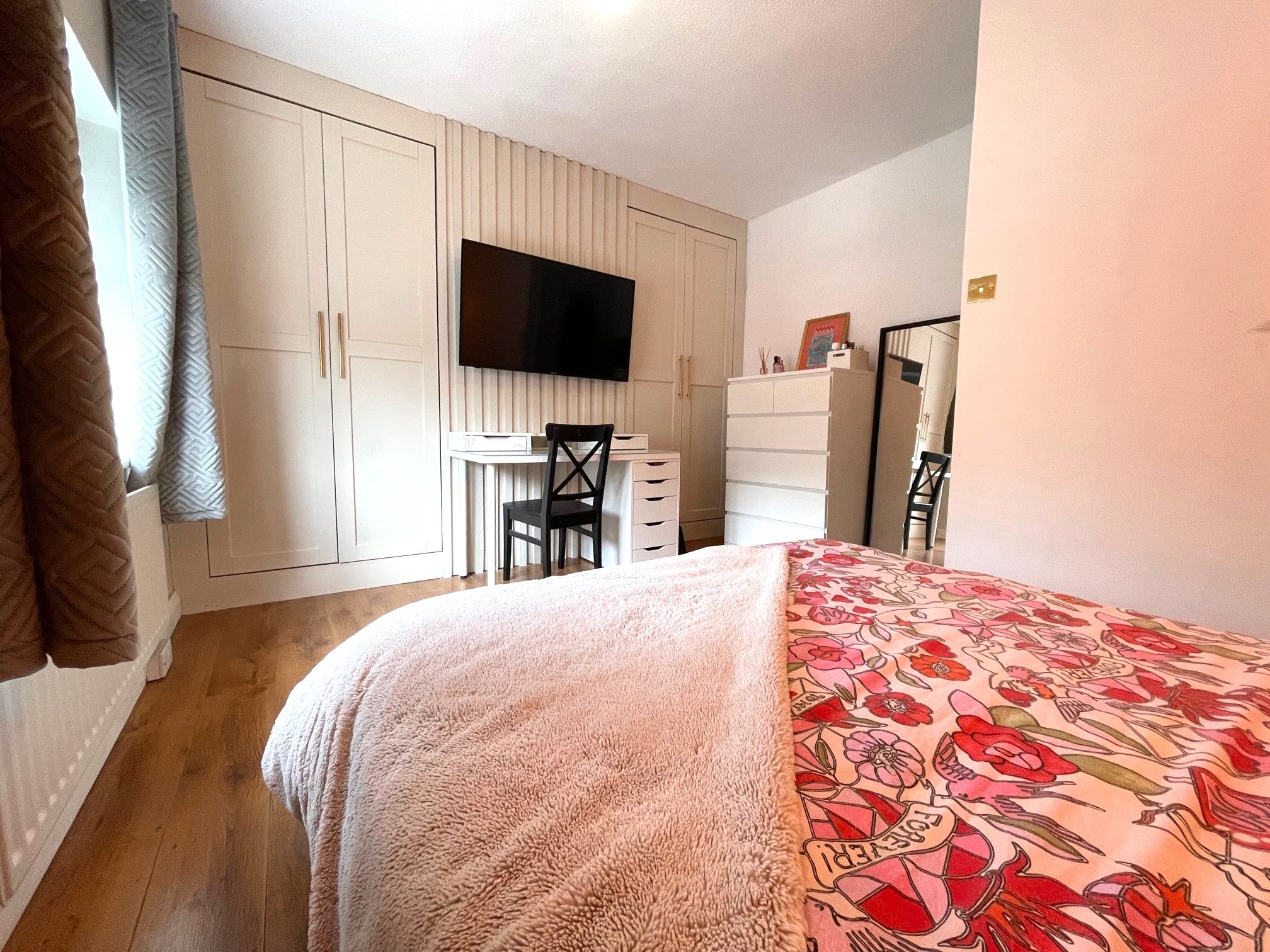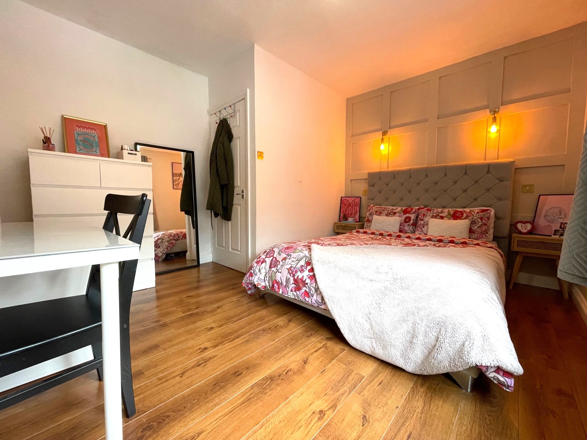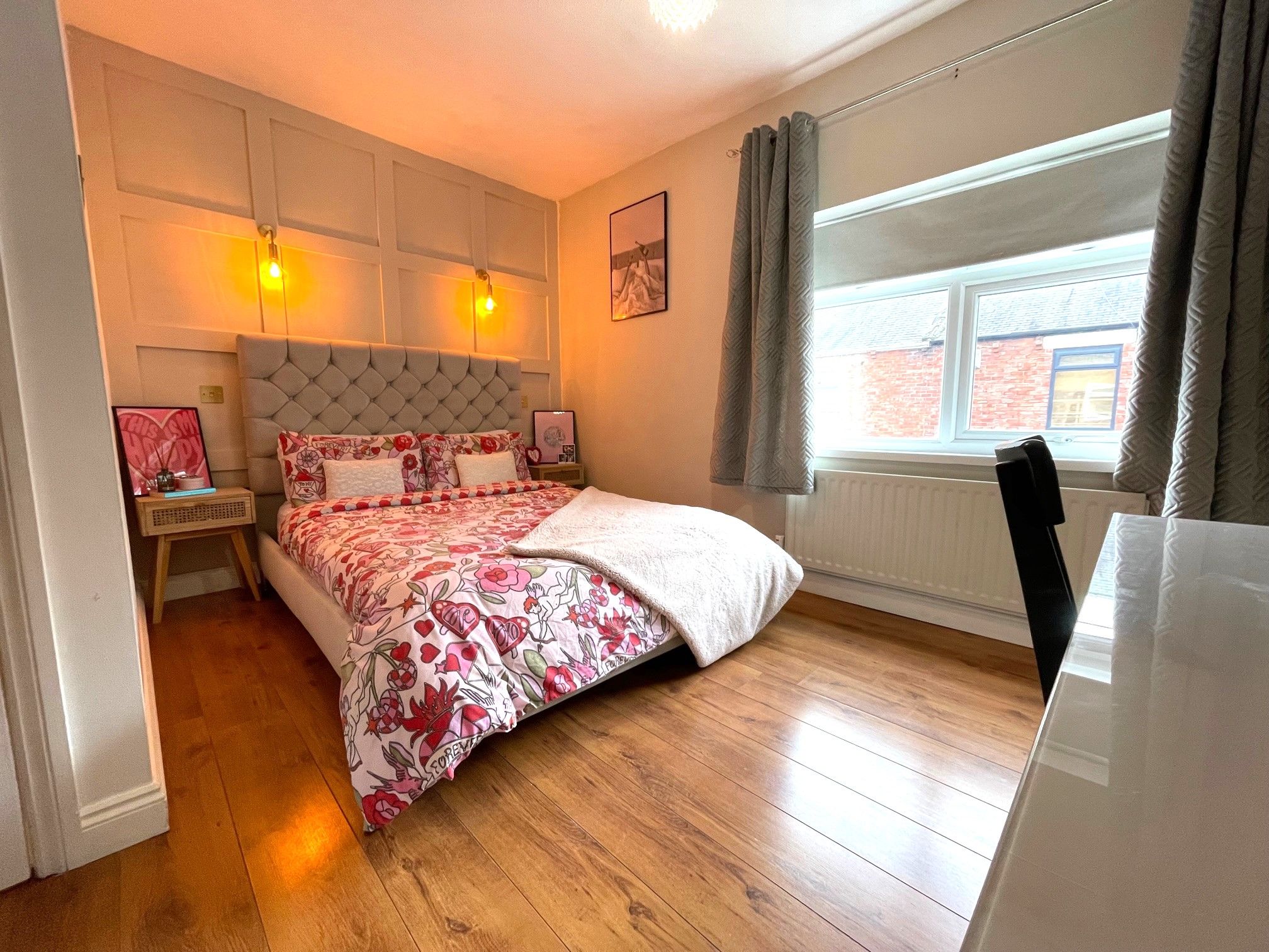 Bedroom One - 8'4 opening to 11'6 x 12'9 (2.56m opening to 3.56m x 3.94m) - Brightly decorated bedroom with laminate flooring, front-facing UPVC double glazed window. Wall mounted radiator. Decorative wall panel feature with wall lights. 2 built-in wardrobes.