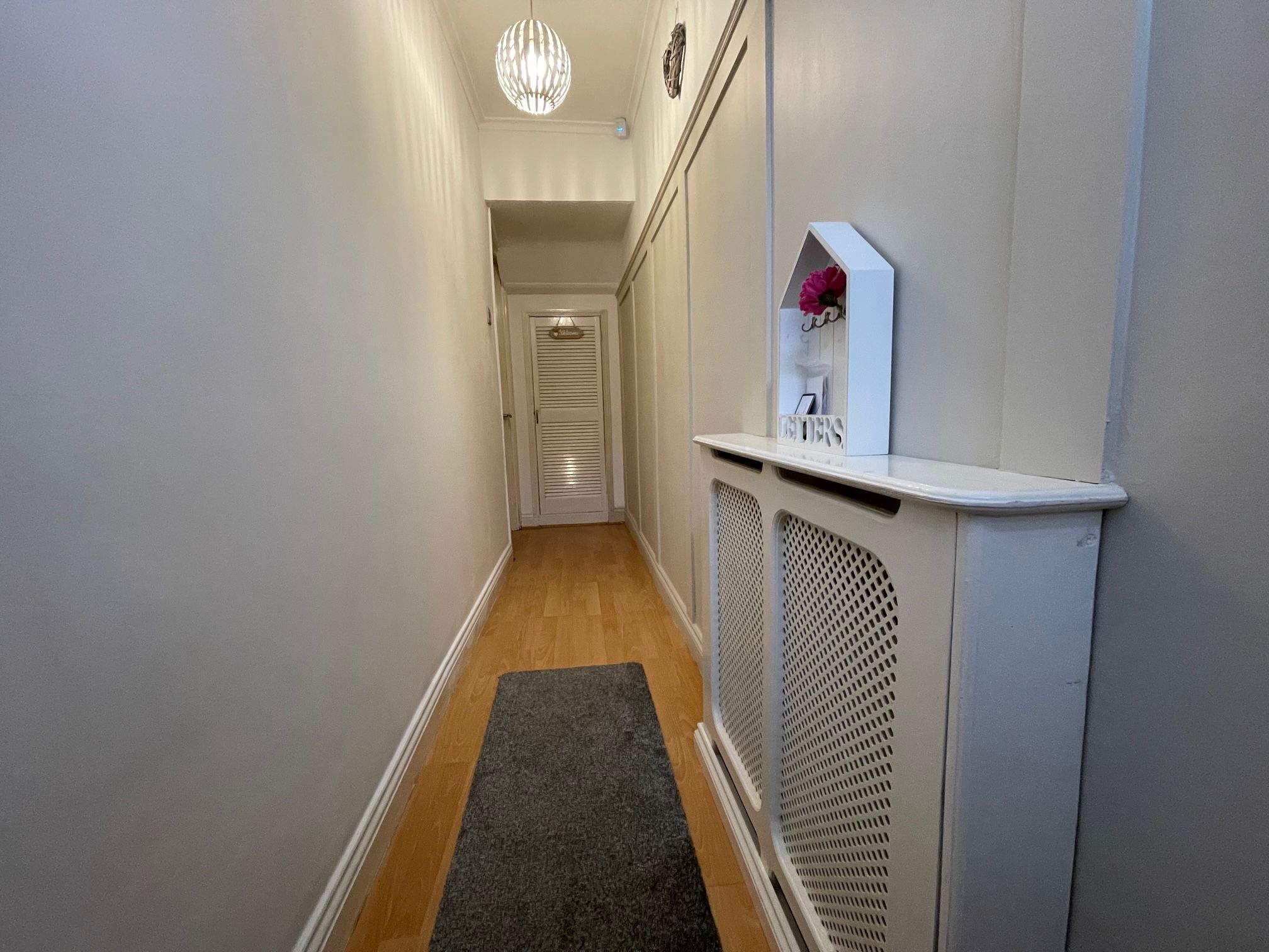 Hallway - Enter via a UPVC front door into a long hallway with laminate flooring, enclosed wall mounted radiator, wood panel wall feature and built-in under stairs cupboard. Access to a snug/dining room.