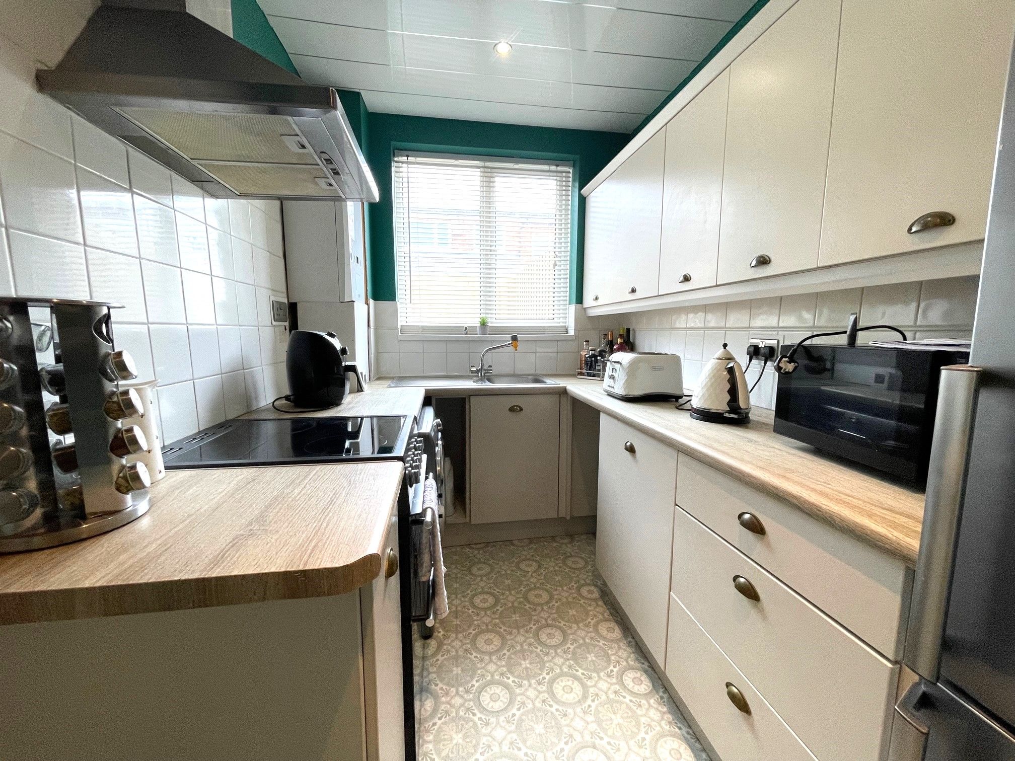 Kitchen - 10' x 6'4 (3.07m x 1.95m) - Vinyl flooring, range of base and wall fitted kitchen units with work surfaces and tiled splashback. Space for a freestanding cooker, washing machine and fridge/freezer. Ideal Logic combination boiler. Stainless steel sink with mixer tap below a rear-facing UPVC double glazed window and access to a study area via a hardwood door.
