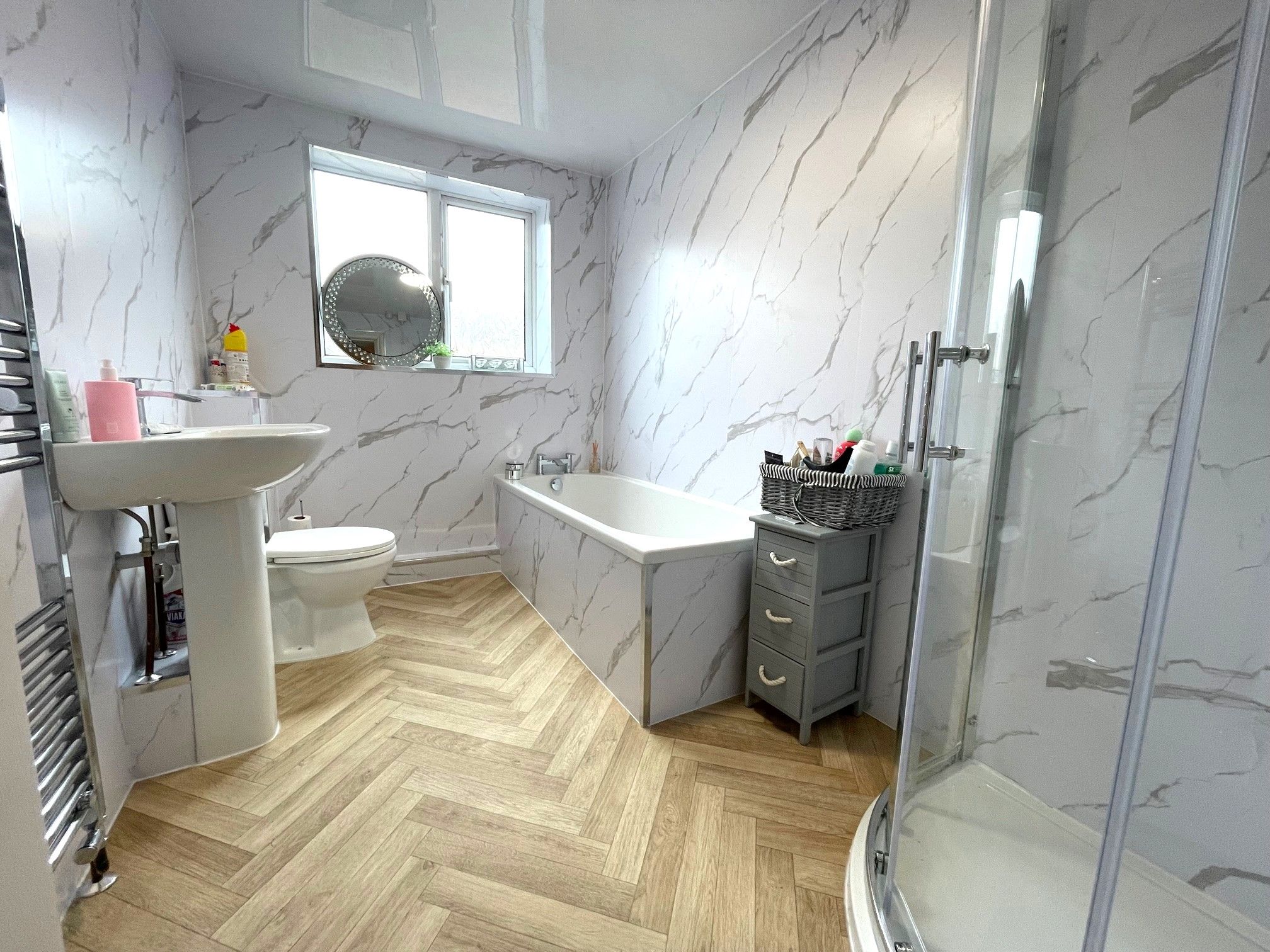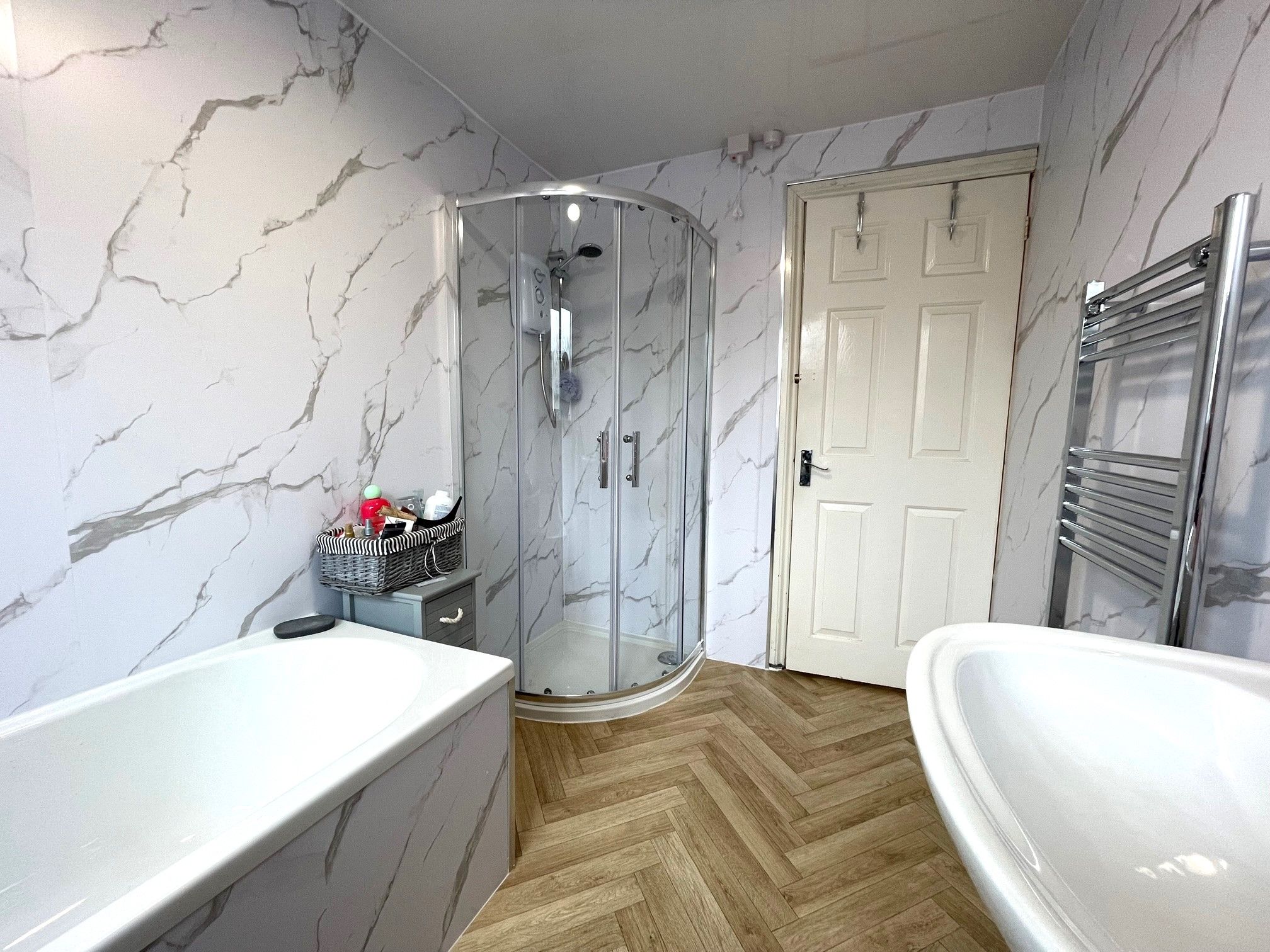 Bathroom - 9'8 x 6'3 (3.01m x 1.92m) - Parquet style vinyl flooring along with a white marble effect full-height cladding splashback throughout. Access to a toilet, wash basin, bath and separate shower cubicle with an electric shower. Rear-facing UPVC double glazed window and wall mounted heated towel rail.