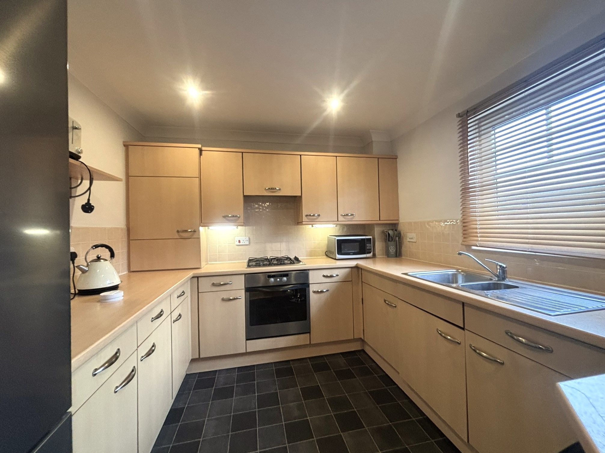 Kitchen (open plan) - 2.78m x 2.90m - featuring double glazed UPVC window with venetian blinds, electric oven & gas hob, extractor hood, stainless steel one and half bowl sink & drainer, mixer tap, tiled splashback, spotlight light fittings & vinyl flooring. There is also a fridge/freezer available to be left.
