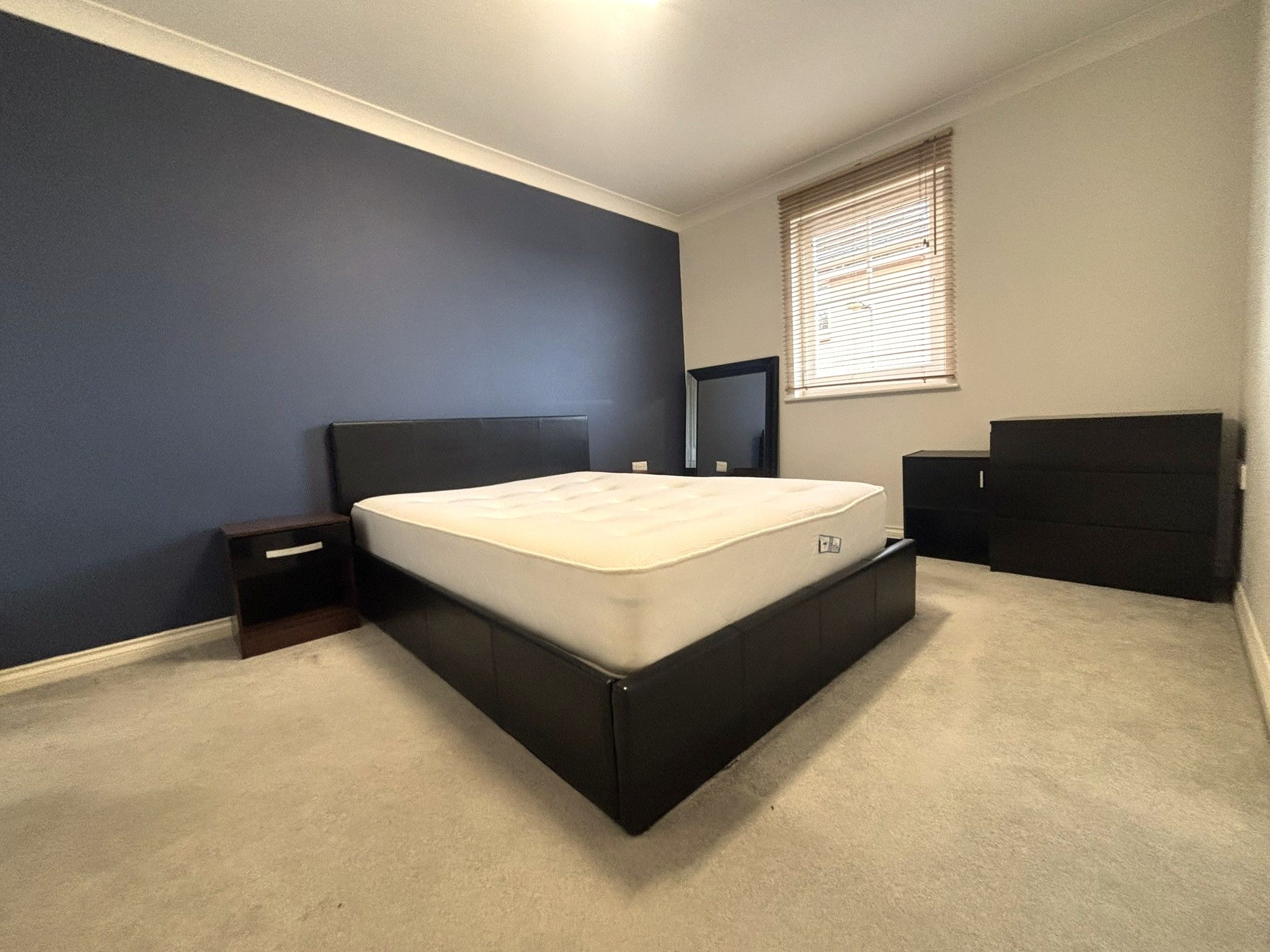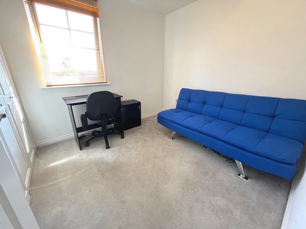 Bedroom 2 - 2.76m x 2.62m - featuring double glazed UPVC window with venetian blinds, built in wardrobe, pendant light fitting & carpeted flooring.
