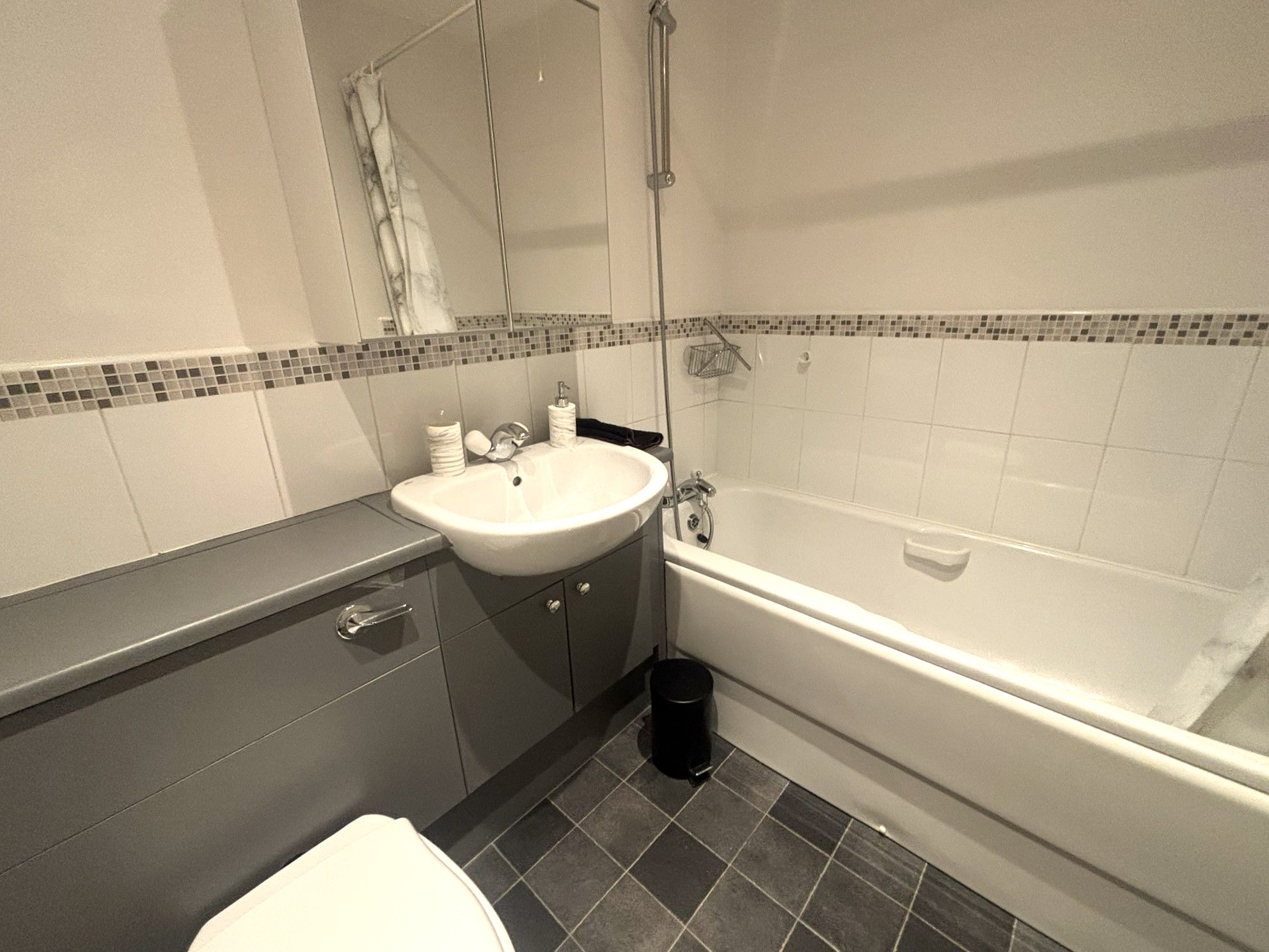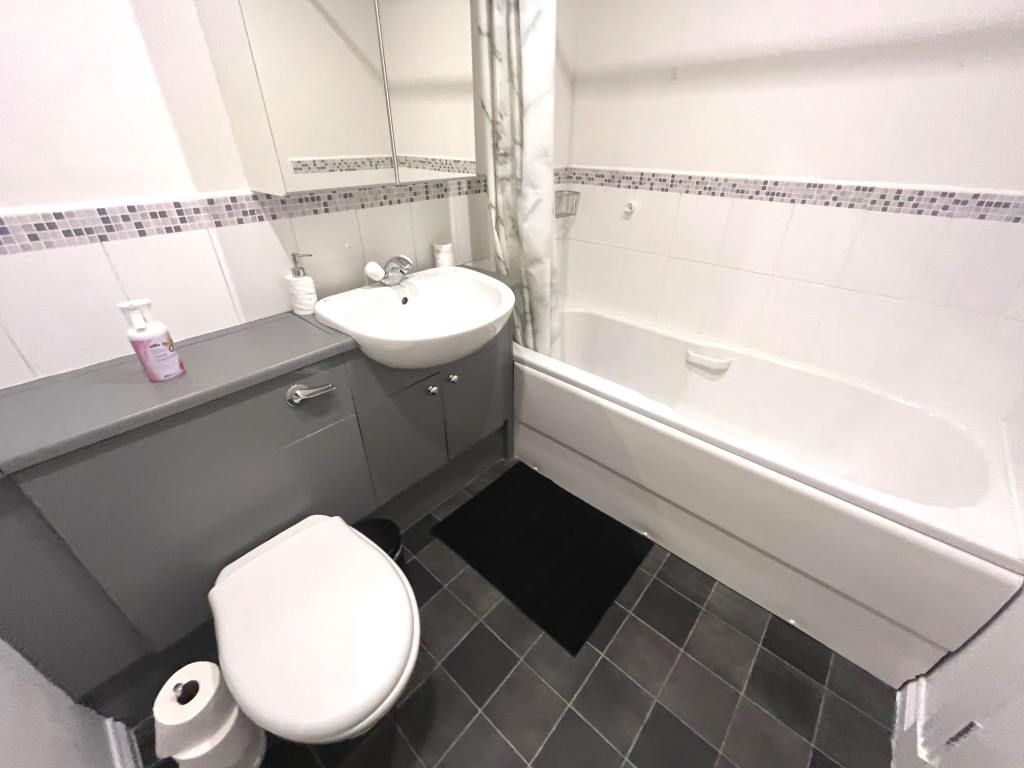 Bathroom - 2.14m x 1.77m - featuring toilet, wash hand basin, bath with shower attachment, tiled wall coverings, single panel radiator, spotlight light fittings, extractor fan & vinyl flooring.