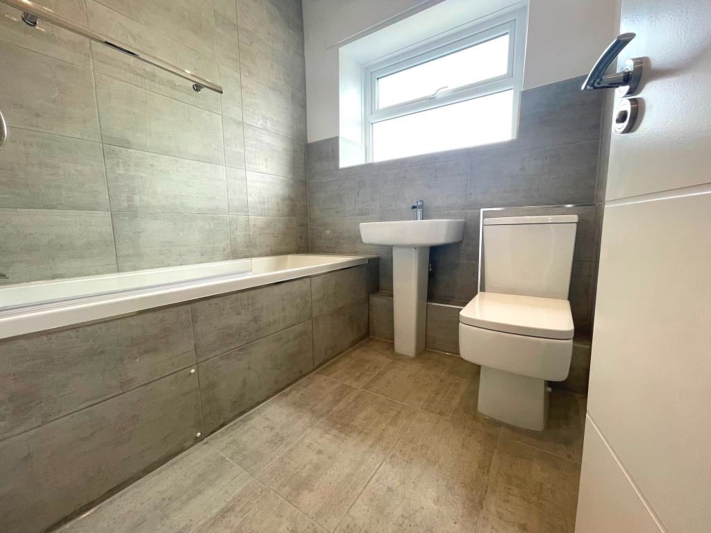 Bathroom - 2.05 x 2.22 - double glazed UPVC to rear, low level WC, wash hand basin, heated towel rail, shower overhead bath with glass screen, spotlight fittings, fully tiled in a modern grey & extractor fan.