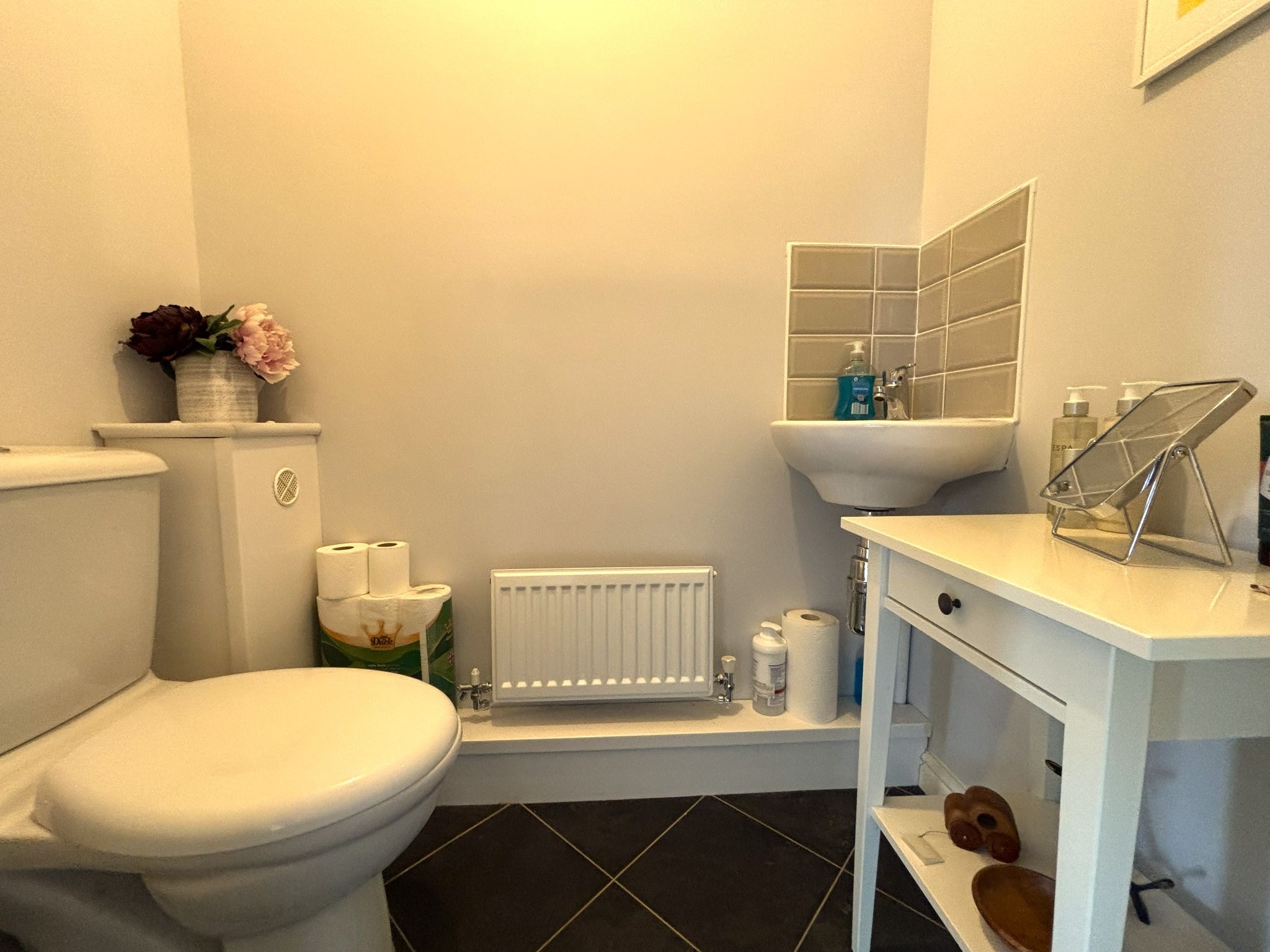 Ground Floor WC 4'9 x 2'6 (1.49m x 0.79m) - Vinyl flooring. Access to a toilet and wash basin. Wall mounted radiator and extractor fan.