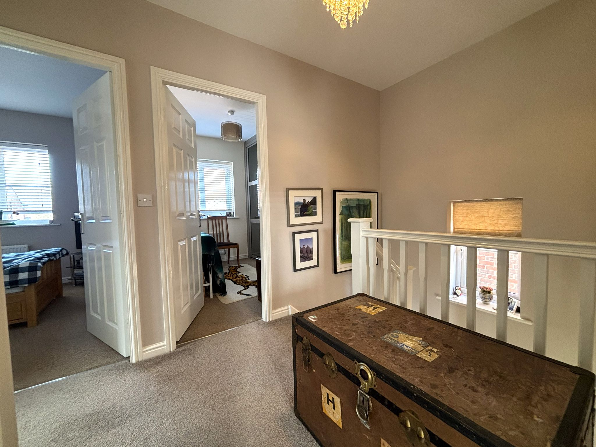 First Floor Landing - Carpeted landing with access to 3 bedrooms, family bathroom, built-in cupboard and loft hatch. Side-facing UPVC double glazed window.