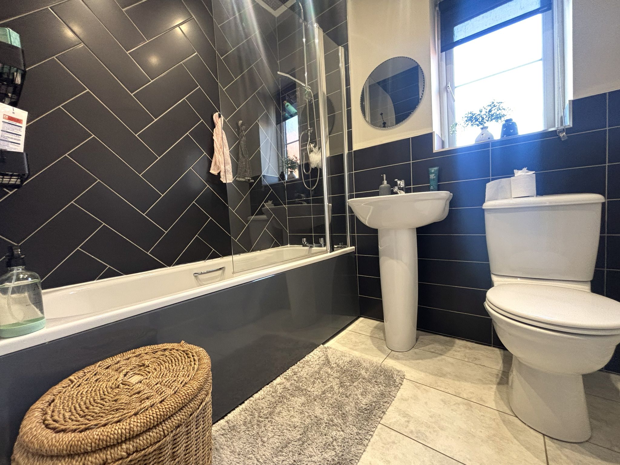 Family Bathroom - uPVC double glazed window, toilet, wash basin, bath with over bath shower, half height wall tiles, heated towel rail, spotlights, extractor fan.