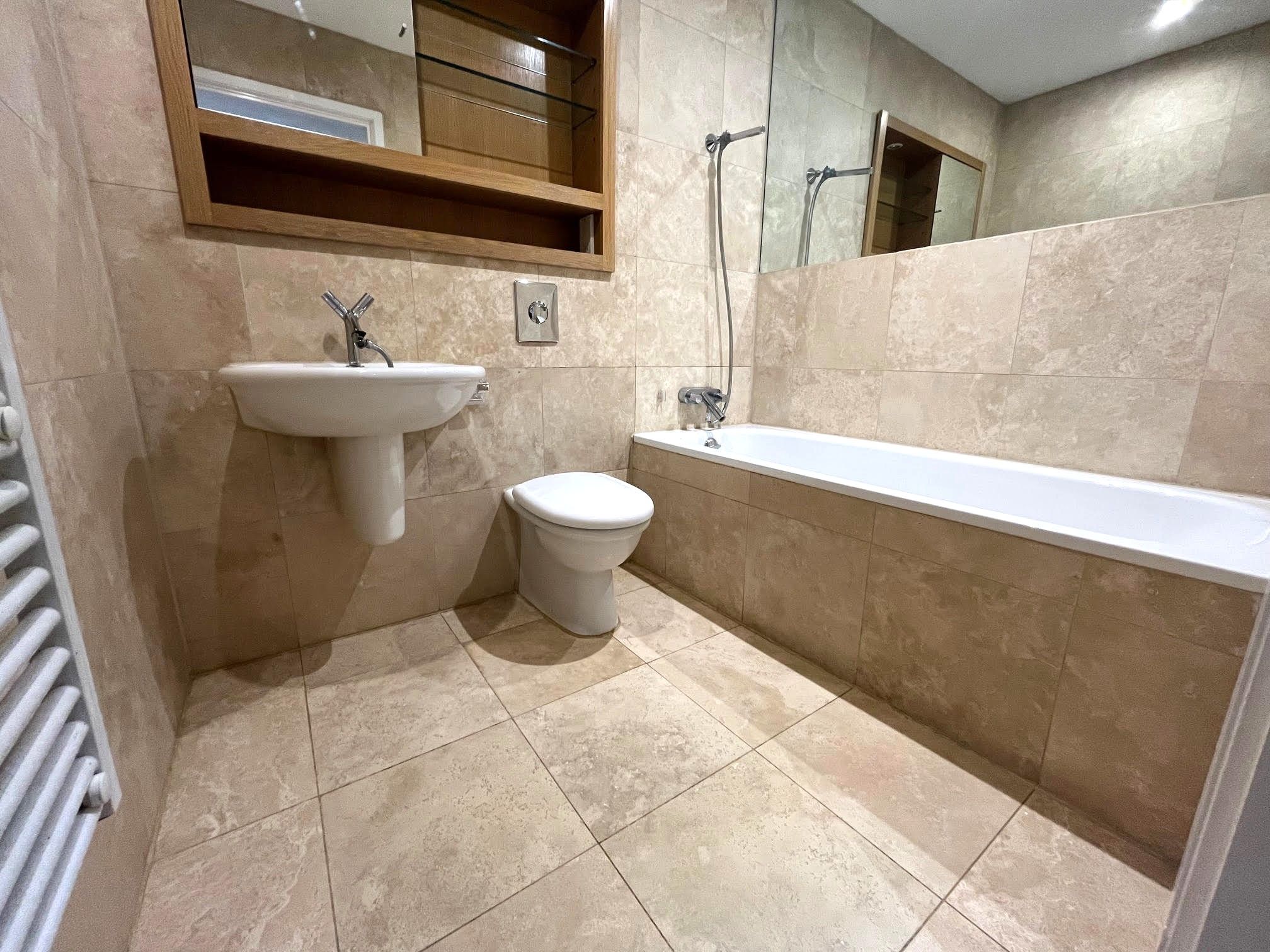 En suite - 2.29 x 1.14 - featuring WC, hand basin, built in storage cupboard, shower enclosure fed by mains, tiled walls & flooring, heated towel rail, spot lights & extractor fan.