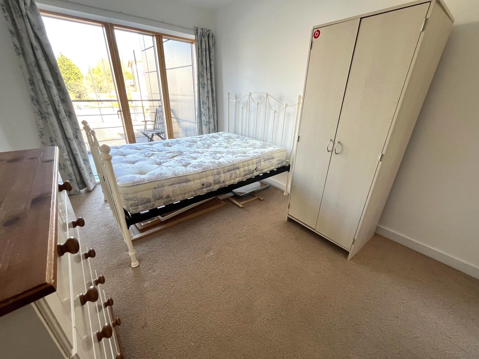 Bedroom 1 - 2.66 x 3.81 - featuring glass doors leading to rear balcony with curtains, double bed base with mattress, wardrobe, drawers, wall mounted heater, spotlights, TV point & carpeted flooring.