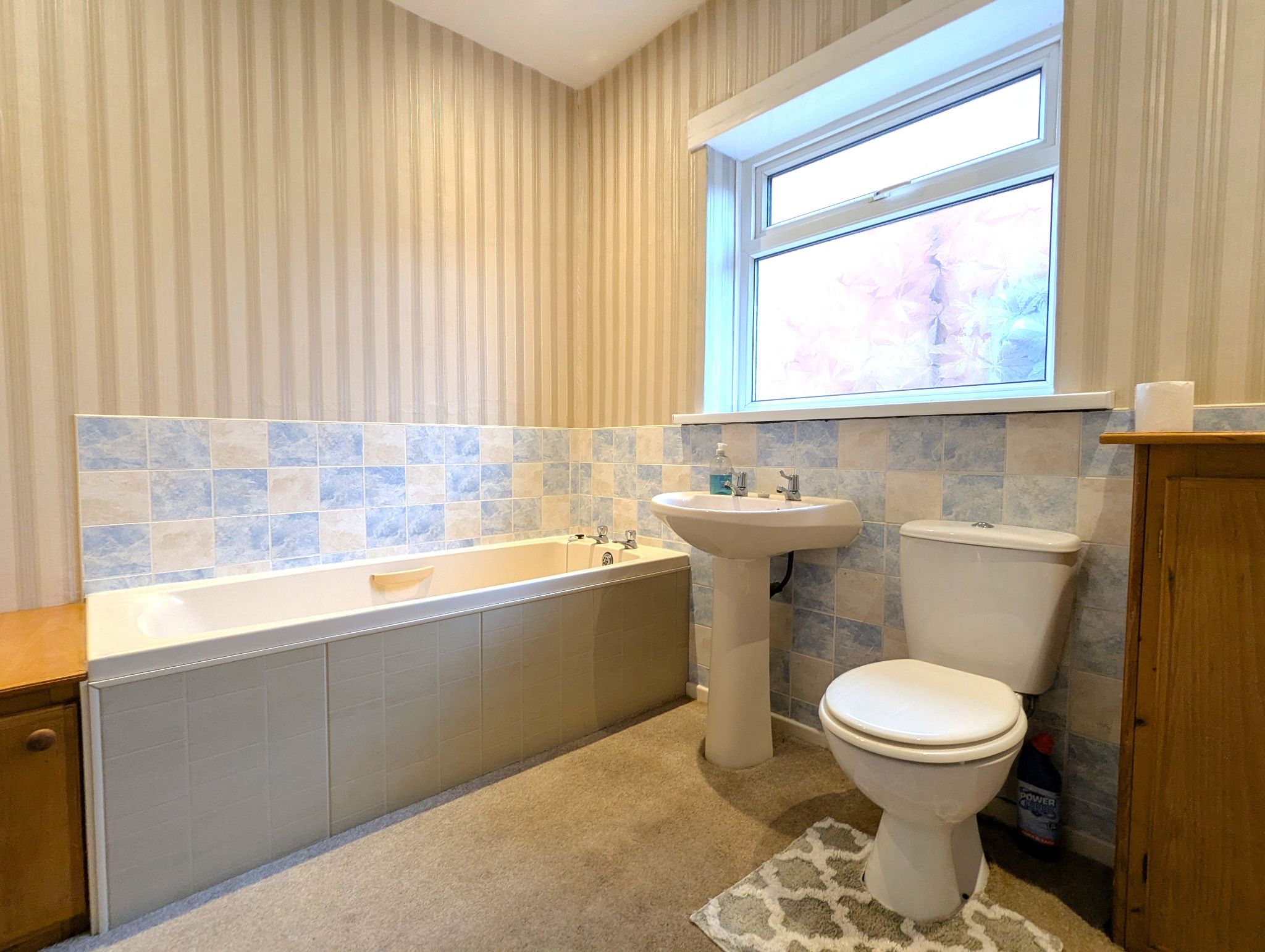 Bathroom - 9' x 6'9 (2.77m x 2.12m) - Carpeted bathroom with access to a toilet, wash basin, bath and separate shower cubicle with a rainfall style mains mixer shower. A low height tiled splashback to the most part with a full height cladding splashback to the shower. 2 side-facing UPVC double glazed windows, wall mounted radiator and loft access via a loft hatch.