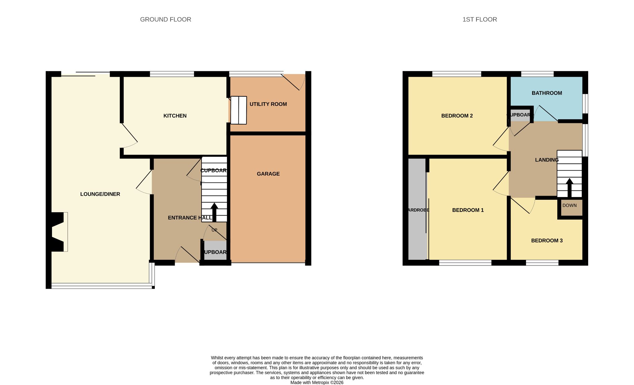 This spacious family home offers a 29ft lounge/diner with a multi-fuel burner. The kitchen offers several integrated appliances including a twin electric oven, fridge, freezer and dishwasher while the utility just off the kitchen accommodates for a freestanding washing machine, tumble dryer and chest freezer. The first floor is home to three generously sized bedrooms along with a bathroom. The master bedroom accommodates for a set of large fitted wardrobes while the third bedroom has a built-in cupboard. The front exterior has an enclosed garden with a drive leading to an attached, standard size garage while to the rear is a private lawned garden. Appealing to a wide range of buyers, this generous family home offers great potential for anyone wishing to use their personal touch.