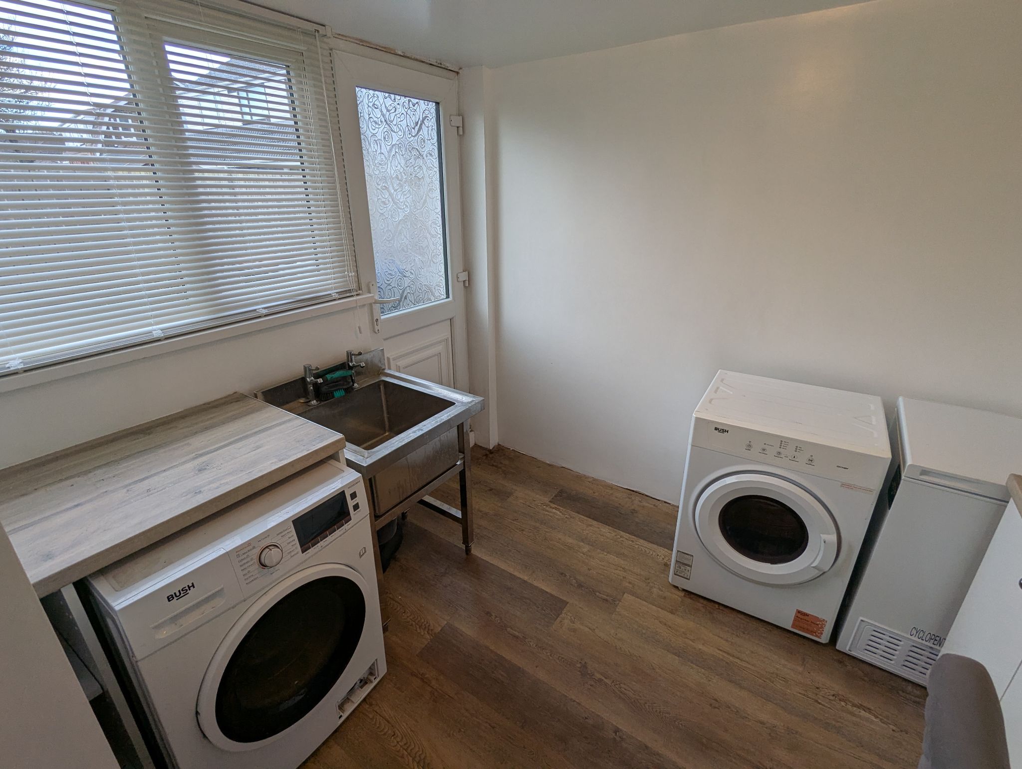 Utility - 8'5 x 8'1 (2.60m x 2.49m) - Vinyl flooring, fitted work surfaces and base units. Plumbing for a freestanding washing machine and standalone stainless steel sink with individual taps. Space for a freestanding tumble dryer and chest freezer. Rear-facing UPVC double glazed window and UPVC door to the rear garden.