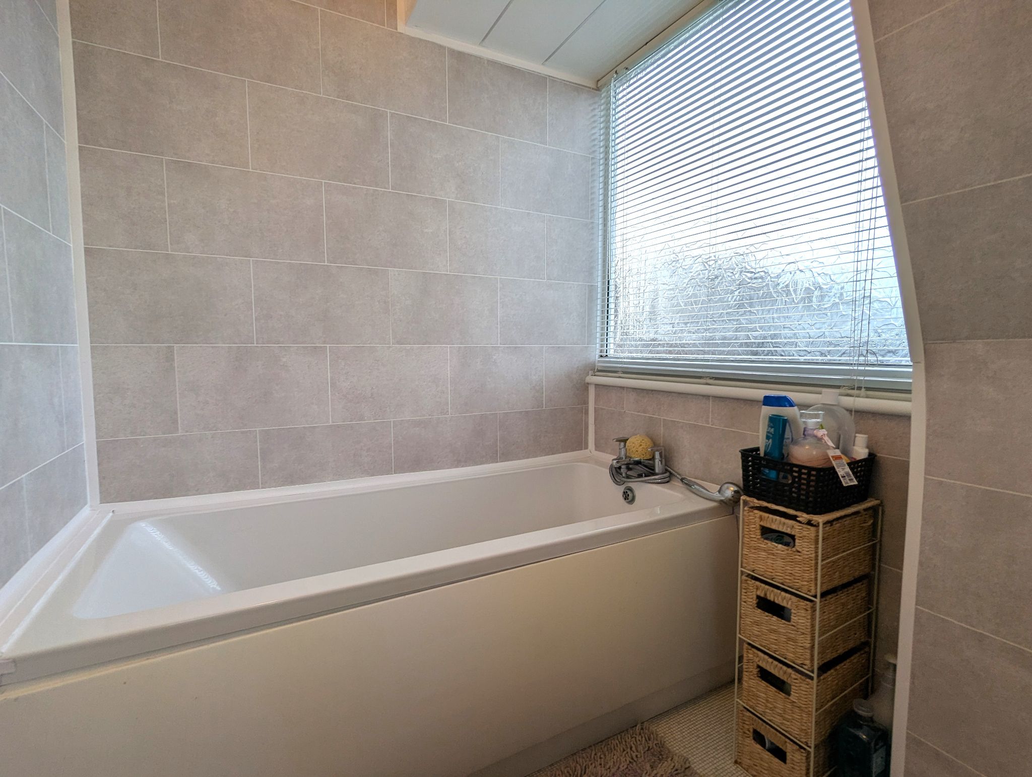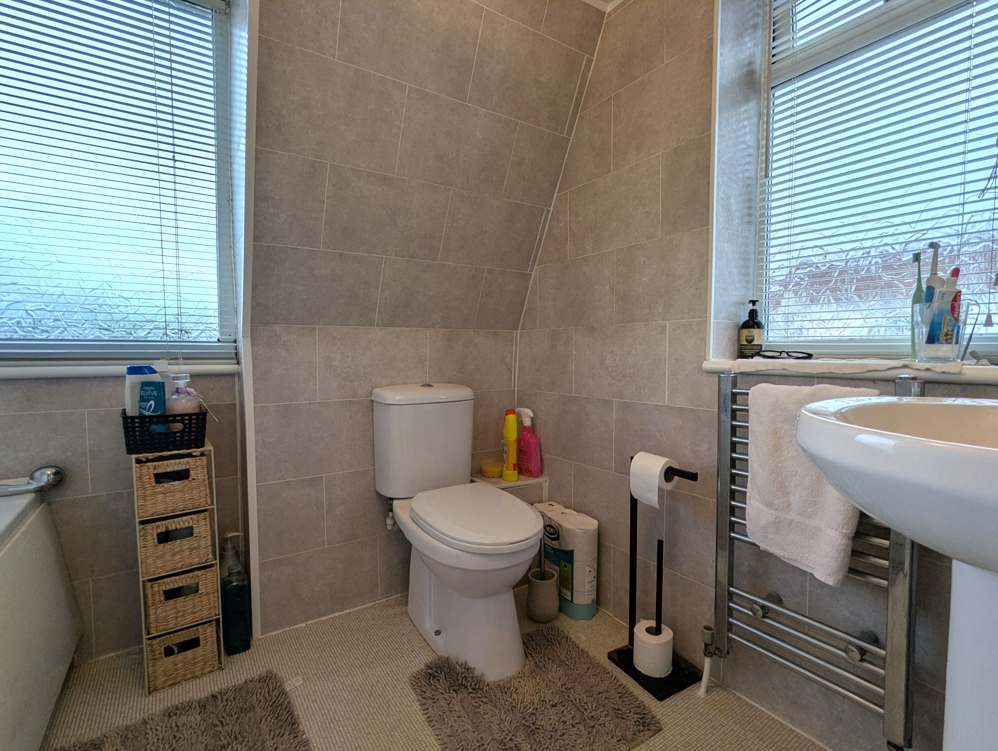 Bathroom - 5'7 x 7'3 (1.73m x 2.22m) - Vinyl flooring with a cladding splashback. Access to a toilet, wash basin and bath. Side and separate rear-facing UPVC double glazed windows. Wall mounted heated towel rail.