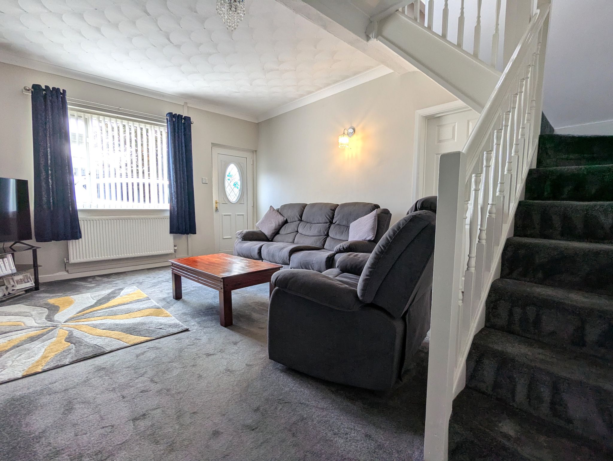 Lounge - 17'3 x 13'5 (5.28m x 4.13m) - Enter via a UPVC front door into a spacious carpeted lounge with a large front-facing UPVC double glazed window, wall mounted radiator and access to a kitchen, master bedroom, carpeted staircase to a converted loft space and under stairs cupboard.