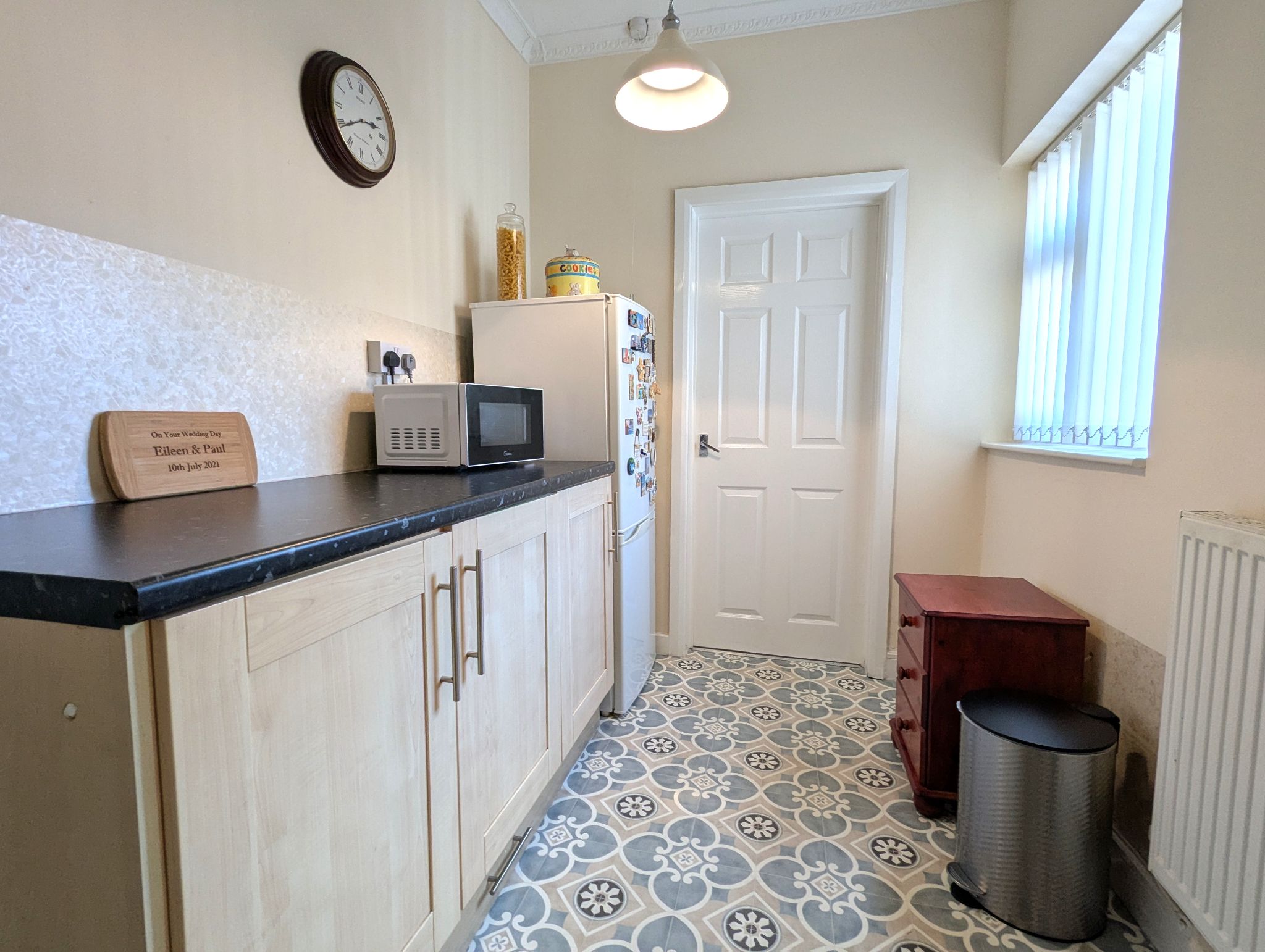 Kitchen - 15'7 x 7' opening to 12'8 (4.80m x 2.15m opening to 3.93m) - 'L' shaped kitchen with a 'Galley' style aspect to the most part. Vinyl flooring throughout. Range of base and wall fitted kitchen units with contrasting work surfaces and tiled splashback. Space for a freestanding cooker with fitted overhead extractor. Space for a freestanding dishwasher and fridge/freezer. Built-in utility cupboard accommodating for a freestanding washing machine and tumble dryer. Stainless steel sink with mixer below a side-facing UPVC double glazed window. Separate rear-facing UPVC double glazed window. Access to a bathroom and dining room/bedroom. Wall mounted radiator.