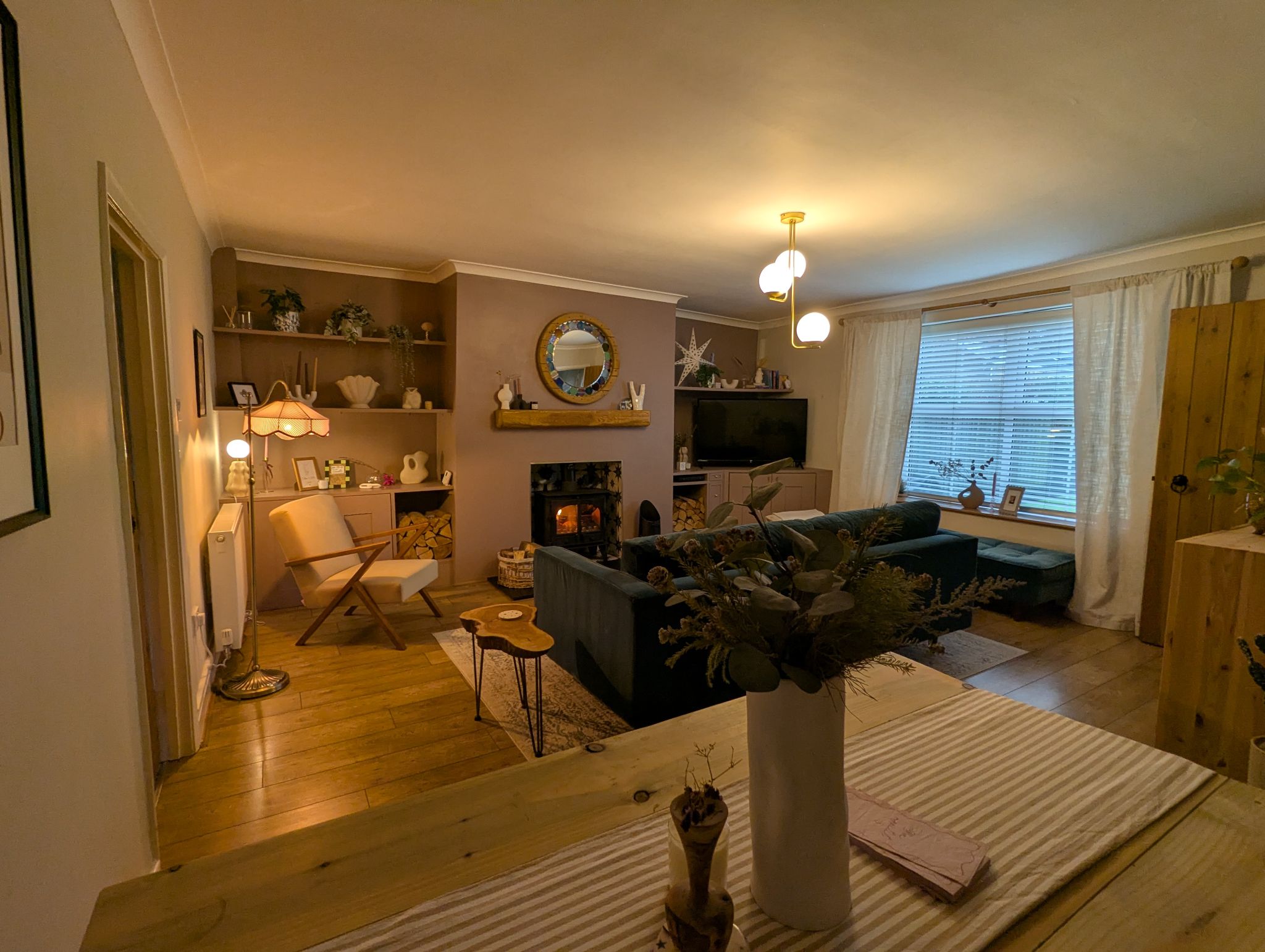 Lounge - 16'7 x 14'5 (5.09m x 4.41m) - Spacious and beautifully decorated lounge with laminate flooring, a front-facing UPVC double glazed window, fitted shelves and cupboard units, 2 wall mounted radiators and log burner as centrepiece. Access to a passage way towards the rear.
