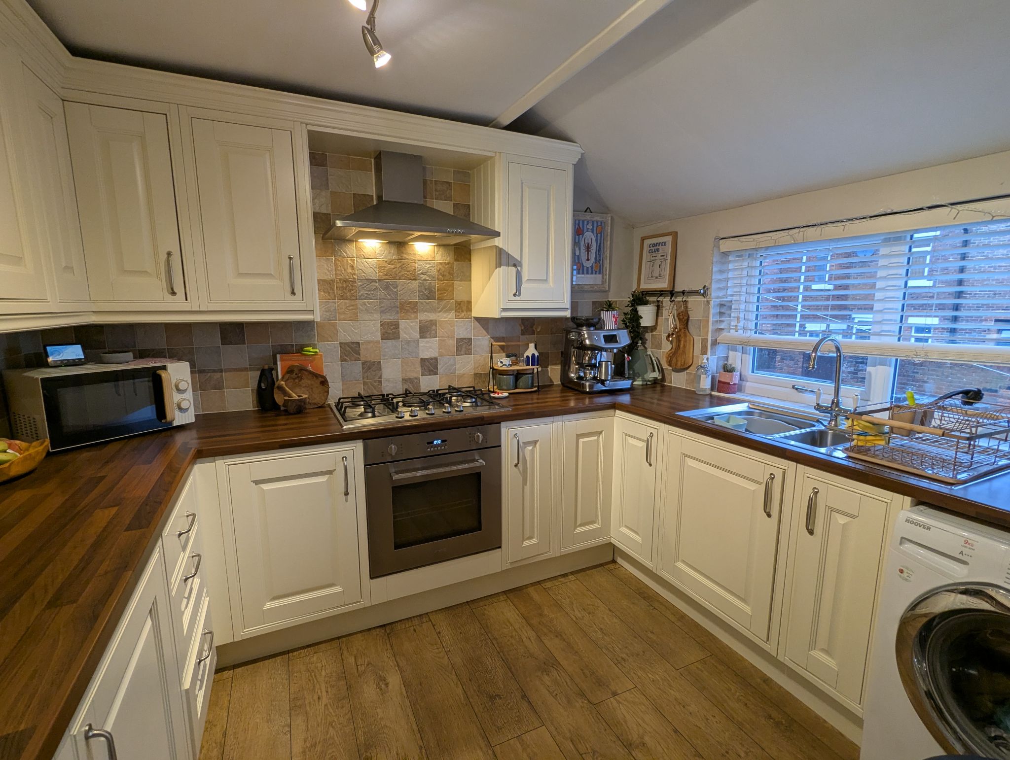 Kitchen - 10'3 x 8'1 (3.13m x 2.46m) - Impressive and contemporary kitchen with a modern but true country feel. Laminate flooring, range of base and wall fitted units with contrasting work surfaces and tiled splashback. Integrated appliances include an electric oven, 5-ring gas burner hob and overhead extractor along with under counter fridge and freezer. Space for a washing machine. Stainless steel one-and-a-half sink with a mixer tap below a rear-facing UPVC double glazed window.