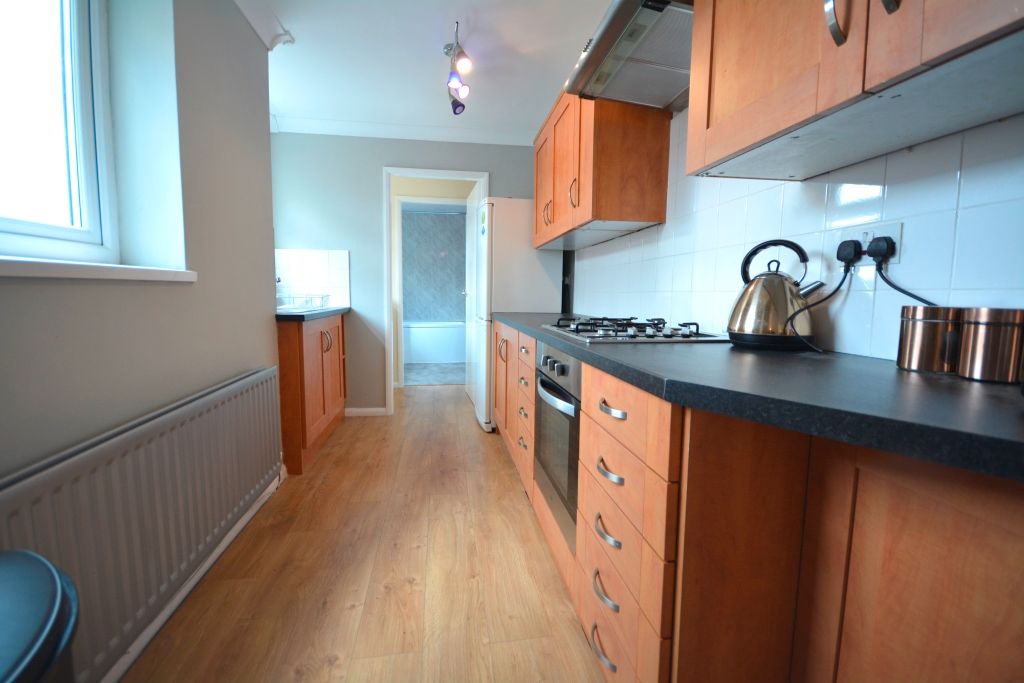Kitchen (1.84 x 3.55) - featuring double glazed UPVC window to side, electric oven & gas hob, extractor hood, space for fridge/freezer, stainless steel one & half bowl sink with drainer and mixer tap, tiled splash back, double panel radiator, coving, pendant light fitting and laminate flooring.