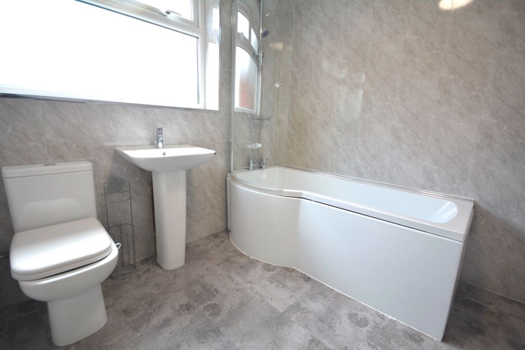 Bathroom (2.32 x 2.25) - featuring double glazed UPVC window to side, low level WC, wash hand basin, bath with overhead shower powered by mains and glass screen, cladding to walls, double panel radiator, pendant light fitting, extractor fan and vinyl flooring.