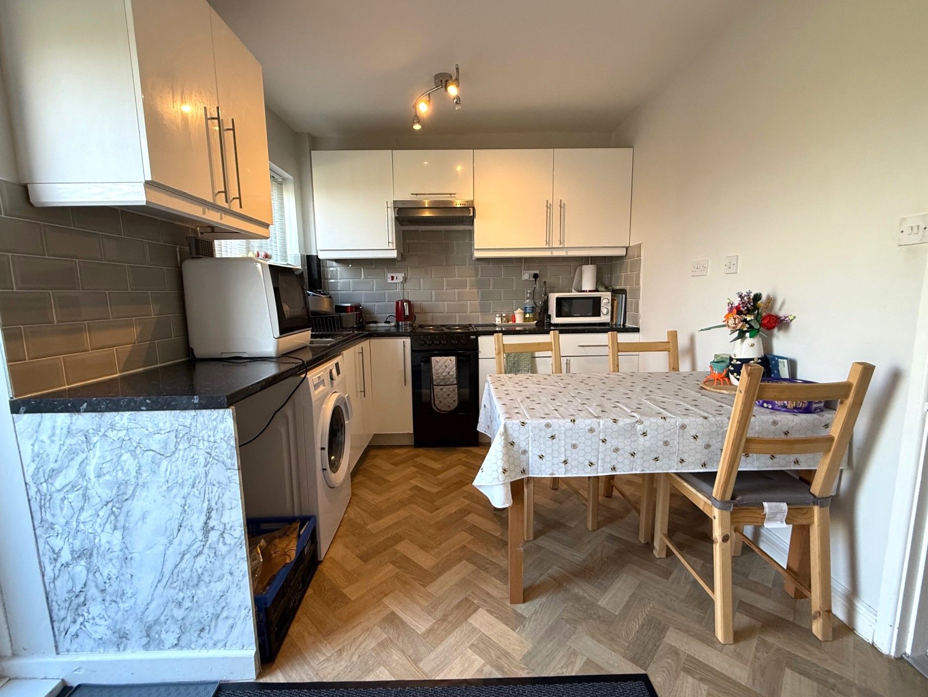 Kitchen/Diner. 14'5 x 8'6 (4.40m x 2.60m). Double glazed patio door leading to the rear garden, double glazed window to rear, extractor fan, plumbing for washing machine, space for fridge-freezer, stainless steel sink, tiled splash backs and radiator.