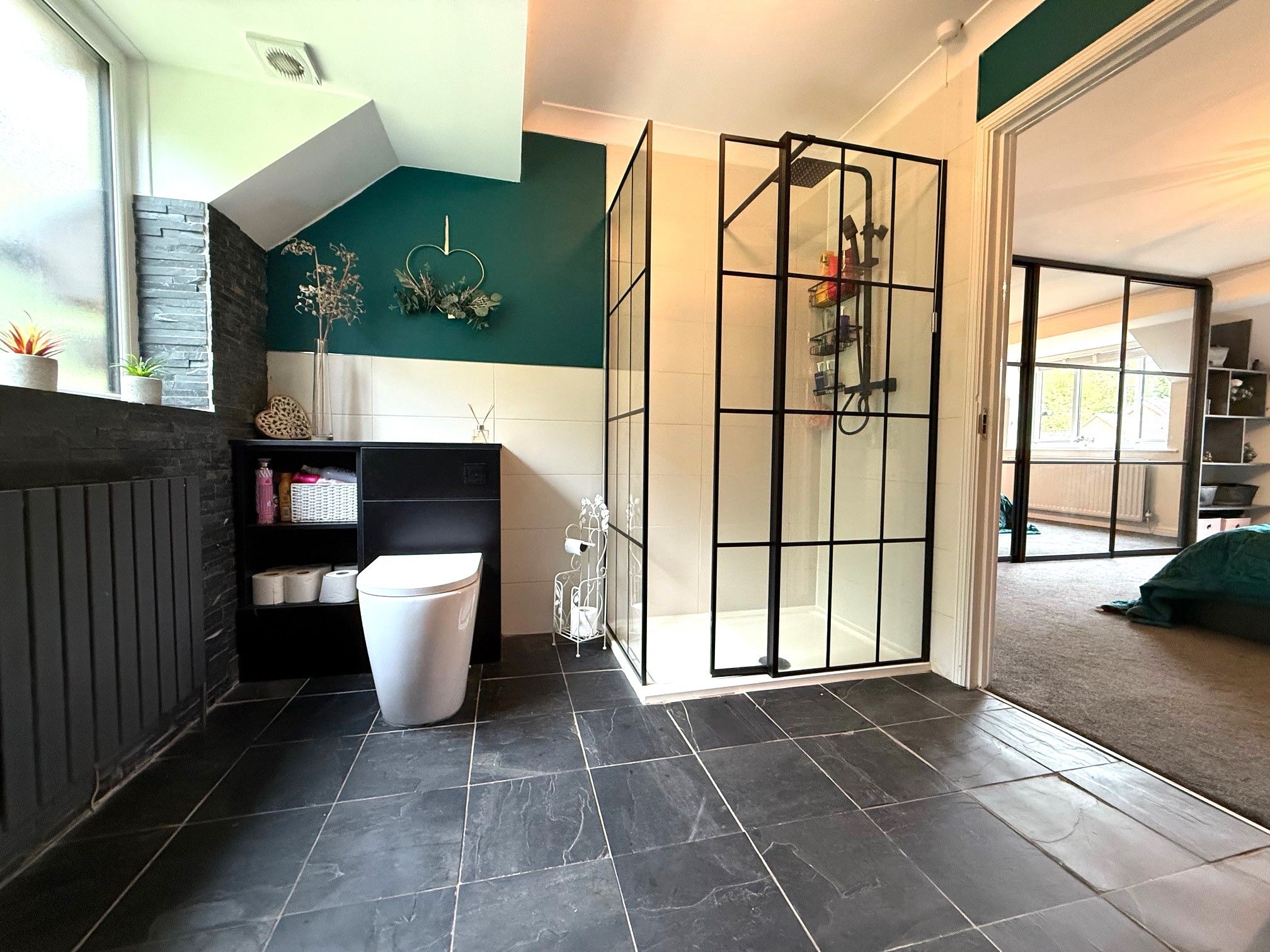 En-Suite. 9'3 x 8'11 (2.81m x 2.71m) Double glazed window to rear, shower enclosure with twin headed shower, WC, hand basin, WC, part tiled walls, part slate tiling to walls and tiled flooring.