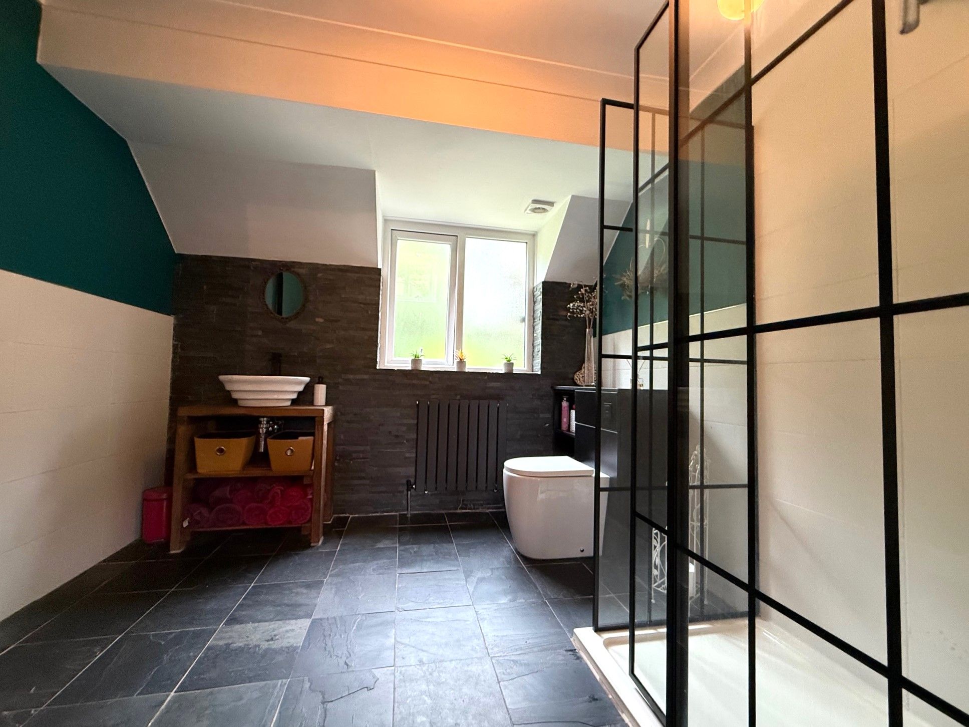 Bathroom. 10'11 x 8'11 (3.32m x 2.72m) Double glazed window to rear, bath with shower attachment, walk in twin head shower enclosure, WC, twin stone sink unit, modern radiator, part tiled walls, part slate walls, spot lights to ceiling, tiled flooring and extractor fan.