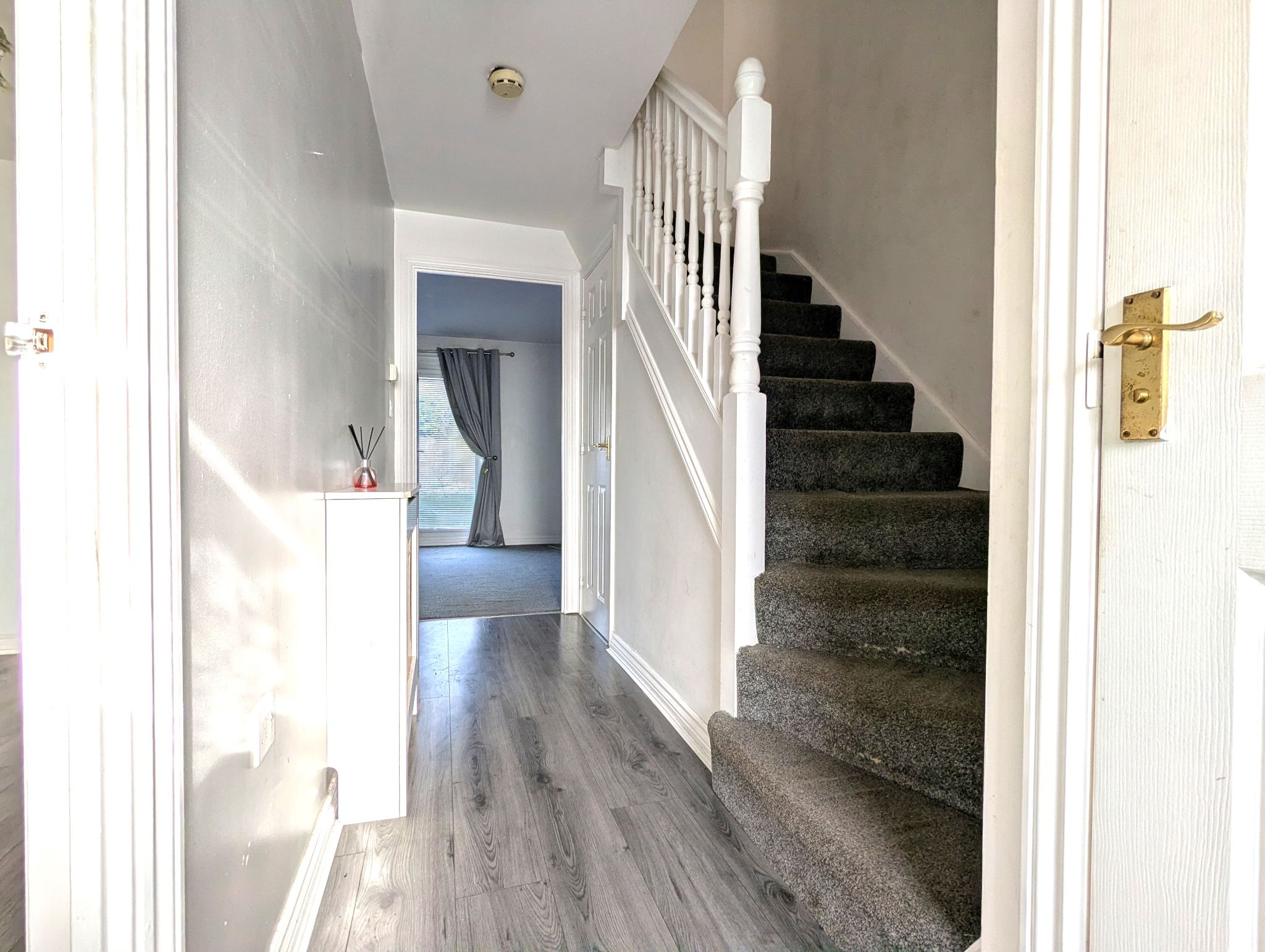 Hallway - Enter via a UPVC front door into a hallway with laminate flooring, offering access to a lounge, kitchen/diner, WC, carpeted staircase to the first floor and under stairs cupboard. Wall mounted radiator.