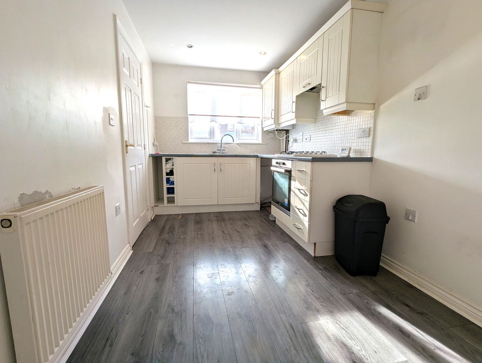 Kitchen/diner - 14'8 x 6'7 (4.52m x 2.07m) - Laminate flooring, range of base and wall fitted units with work surfaces and tiled splashback. Integrated electric oven and gas hob with overhead extractor. Space for a freestanding washing machine and fridge/freezer. Enclosed Baxi combination boiler. Stainless steel sink with mixer tap below a front-facing UPVC double glazed window and wall mounted radiator.