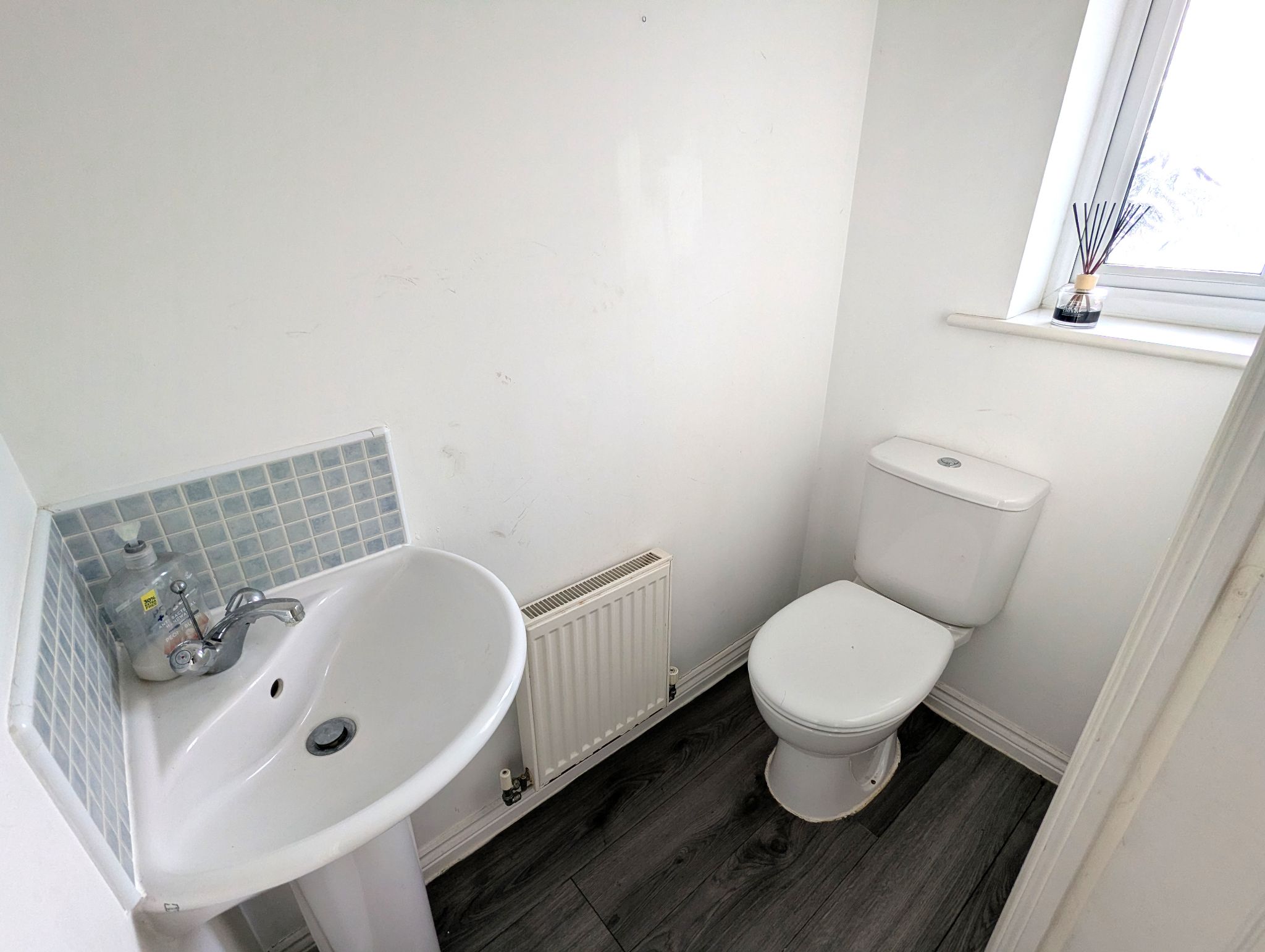 WC - Laminate flooring, access to a toilet and wash basin. Front-facing UPVC double glazed window and wall mounted radiator.