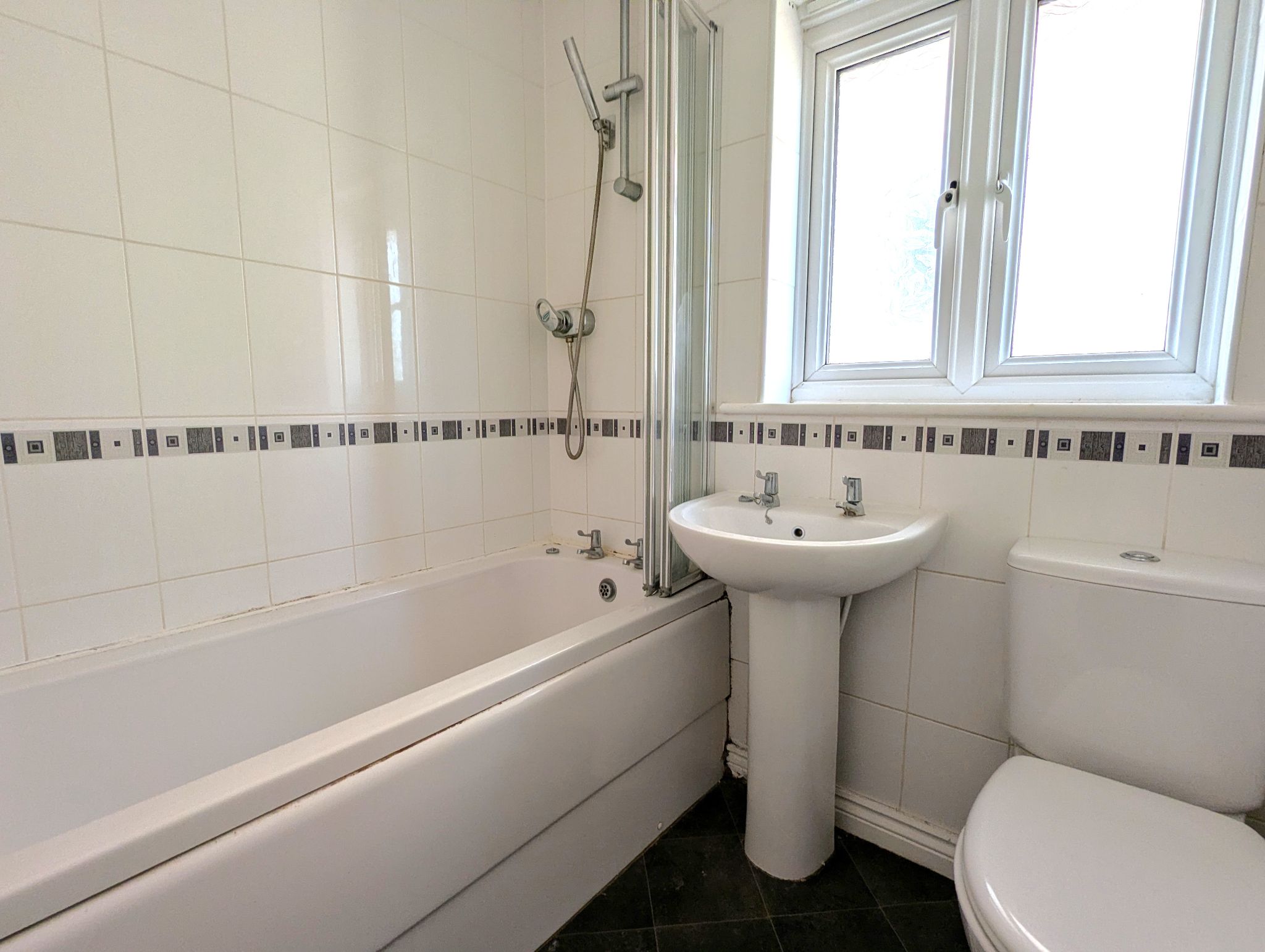 Bathroom - 6' x 5'1 (1.84m x 1.57m) - Vinyl flooring, access to a toilet, wash basin and bath with overhead mains mixer shower and tiled splashback. Side-facing UPVC double glazed window and wall mounted radiator.