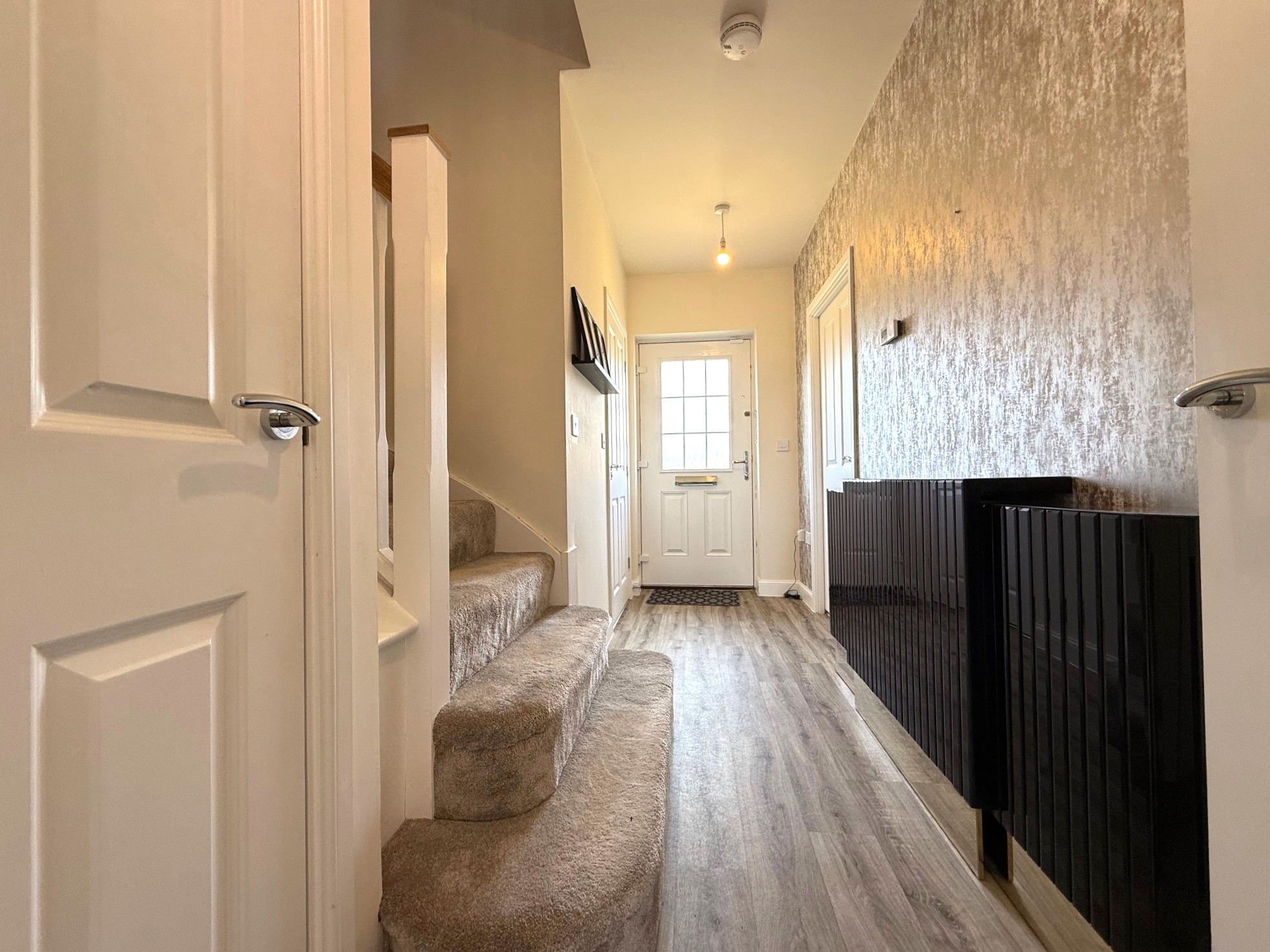 Hallway. Accessed via a composite door, radiator, smoke alarm, storage cupboard, telephone point and stairs to the upper floor.