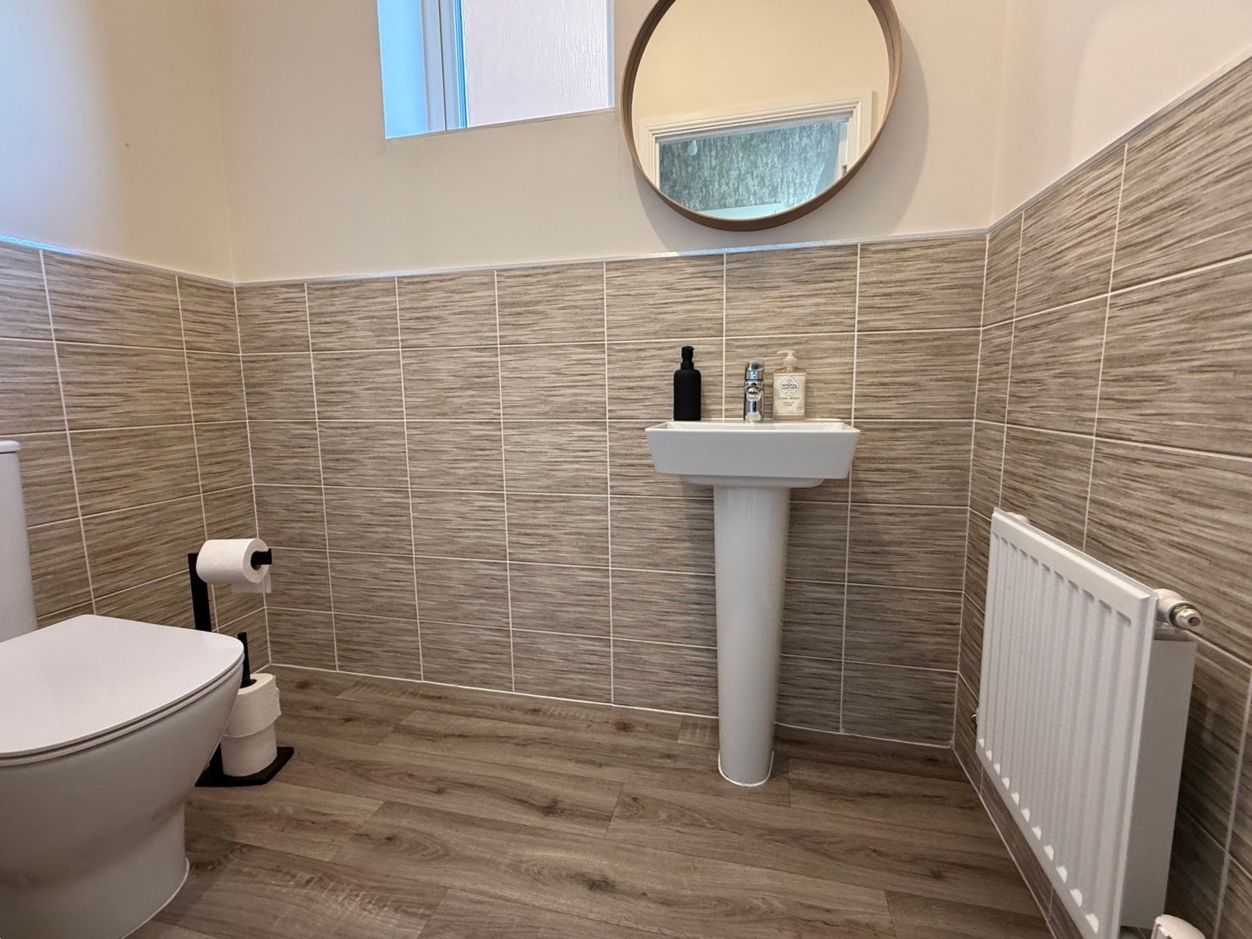Ground Floor WC. 6'4 x 3'10 (1.93m x 1.18m) Double glazed window to side, hand basin, WC, part tiled walls and radiator