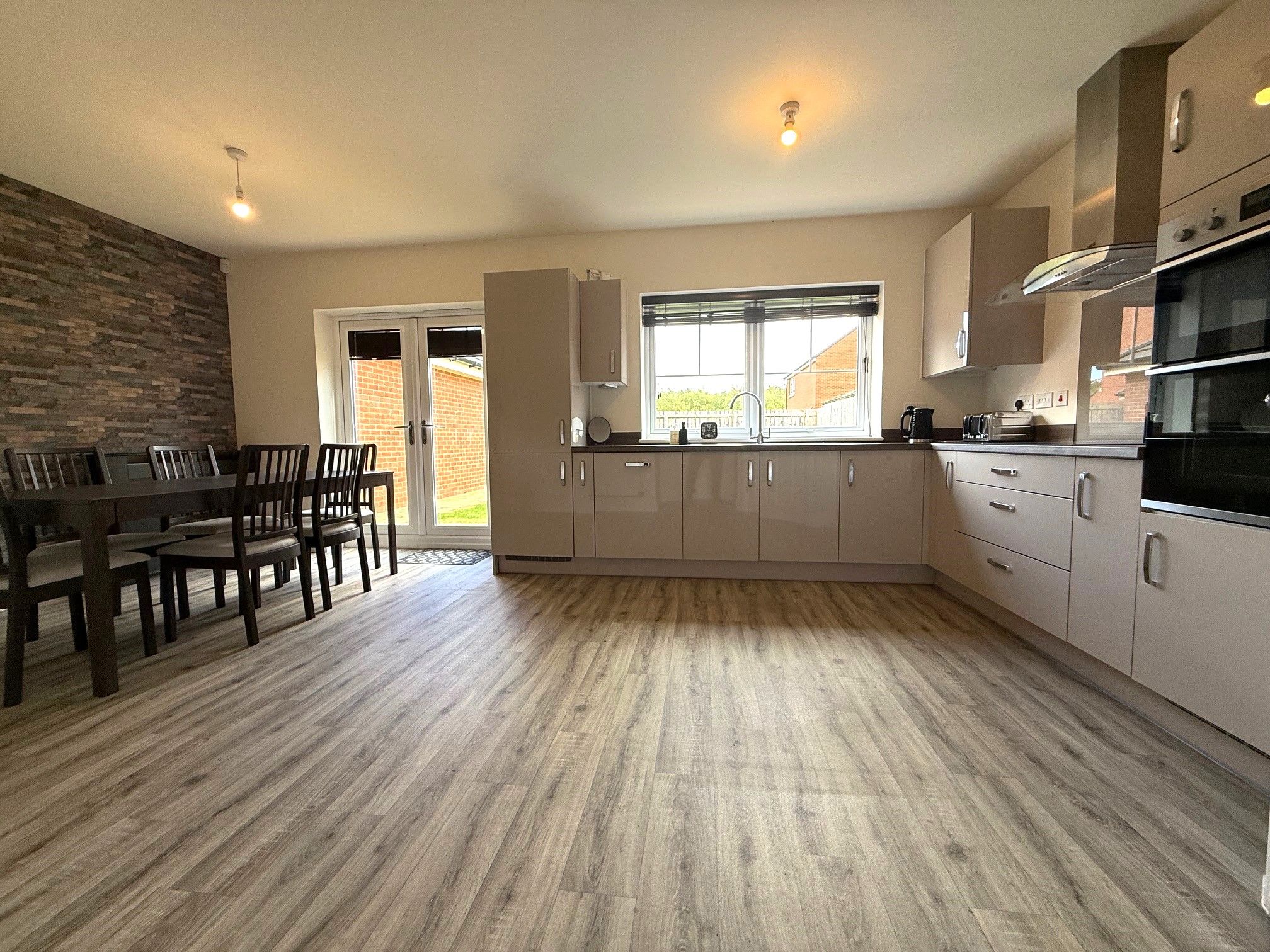 Kitchen / Diner / Sitting Area. French doors to rear garden, double glazed window to rear, wide range of wall and base units, integrated double electric oven, ceramic hob, extractor hood, dishwasher, fridge freezer, stainless steel sink and drainer, mixer tap, 2 x radiators, wall mounted gas central heating boiler and good sized storage cupboard.