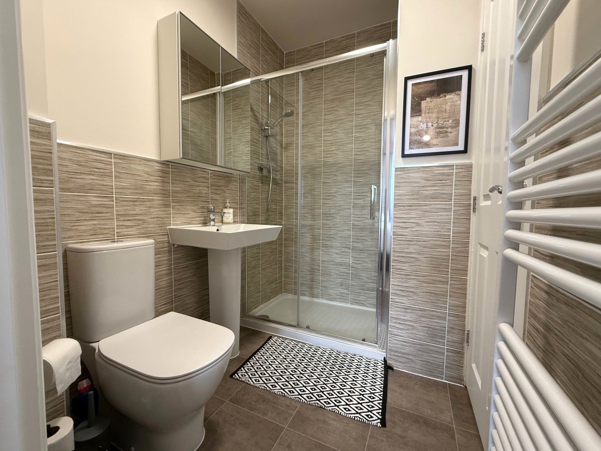 Family Bathroom. 6'8 x 5'8 (2.03m x 1.72m) Double glazed window to side, bath with mains supplied shower over, hand basin, WC, fully tiled walls, heated towel rail and extractor fan.